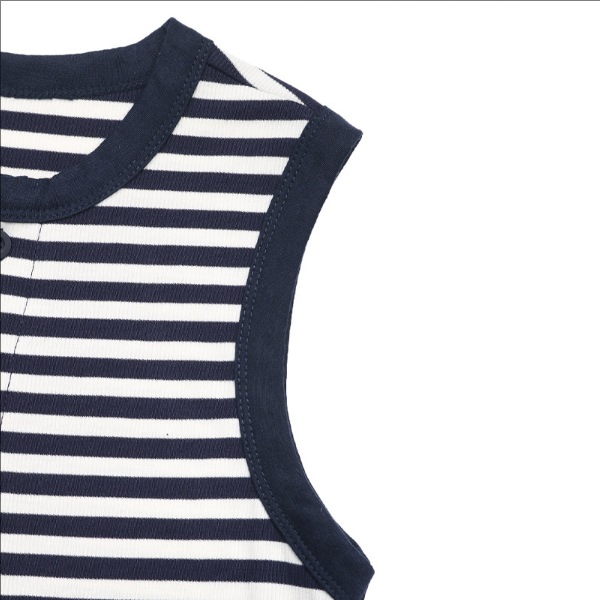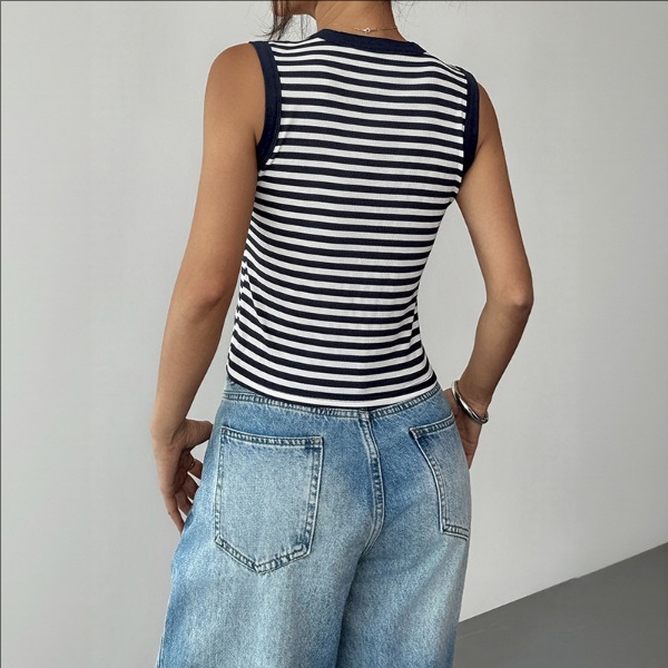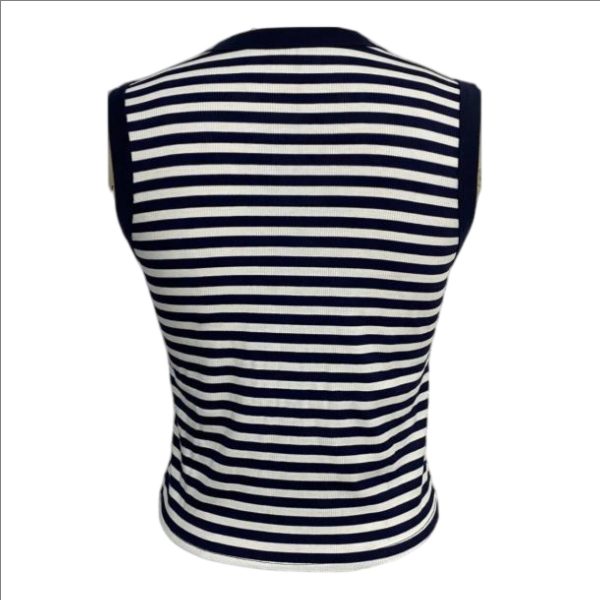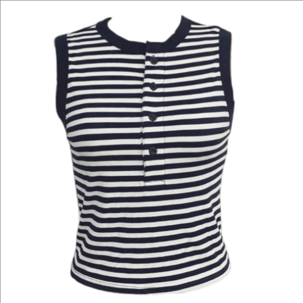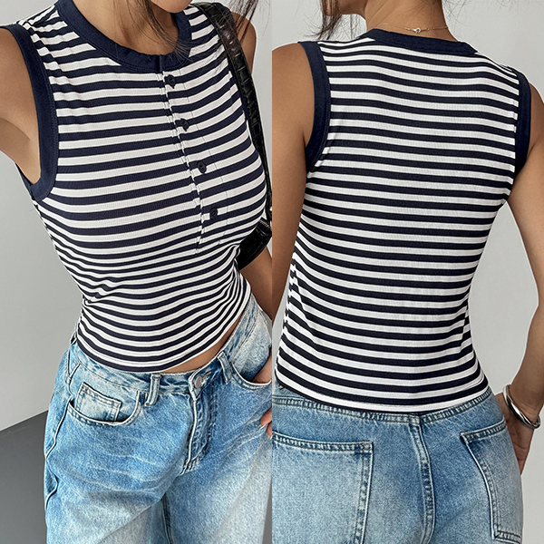 Featuring a classic crew neckline and convenient front button detailing, this sleeveless design offers a perfect blend of comfort and polish. The timeless stripe pattern adds visual interest while remaining versatile enough to pair with virtually anything. Pair with jeans for a casual look~