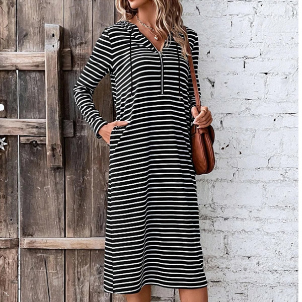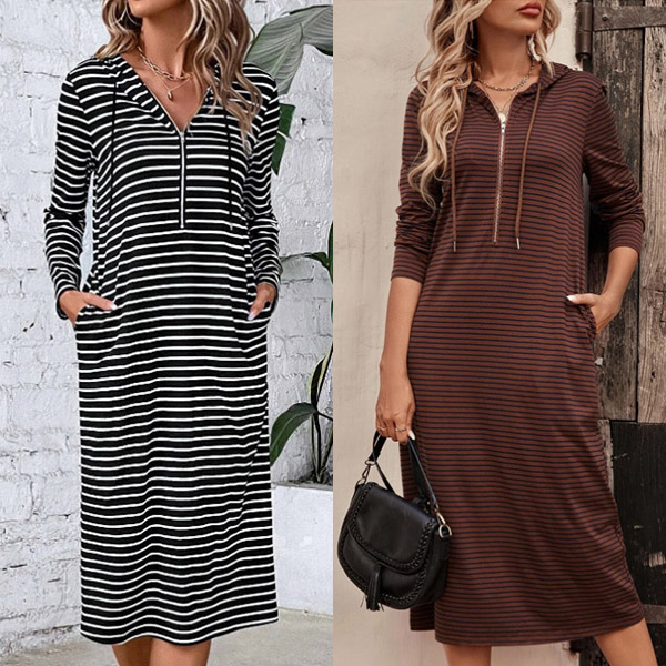 This dress is the perfect combination of comfort and style. The stripe print adds a trendy and playful touch, while the half-zipper and drawstring hood create a casual and relaxed look.
