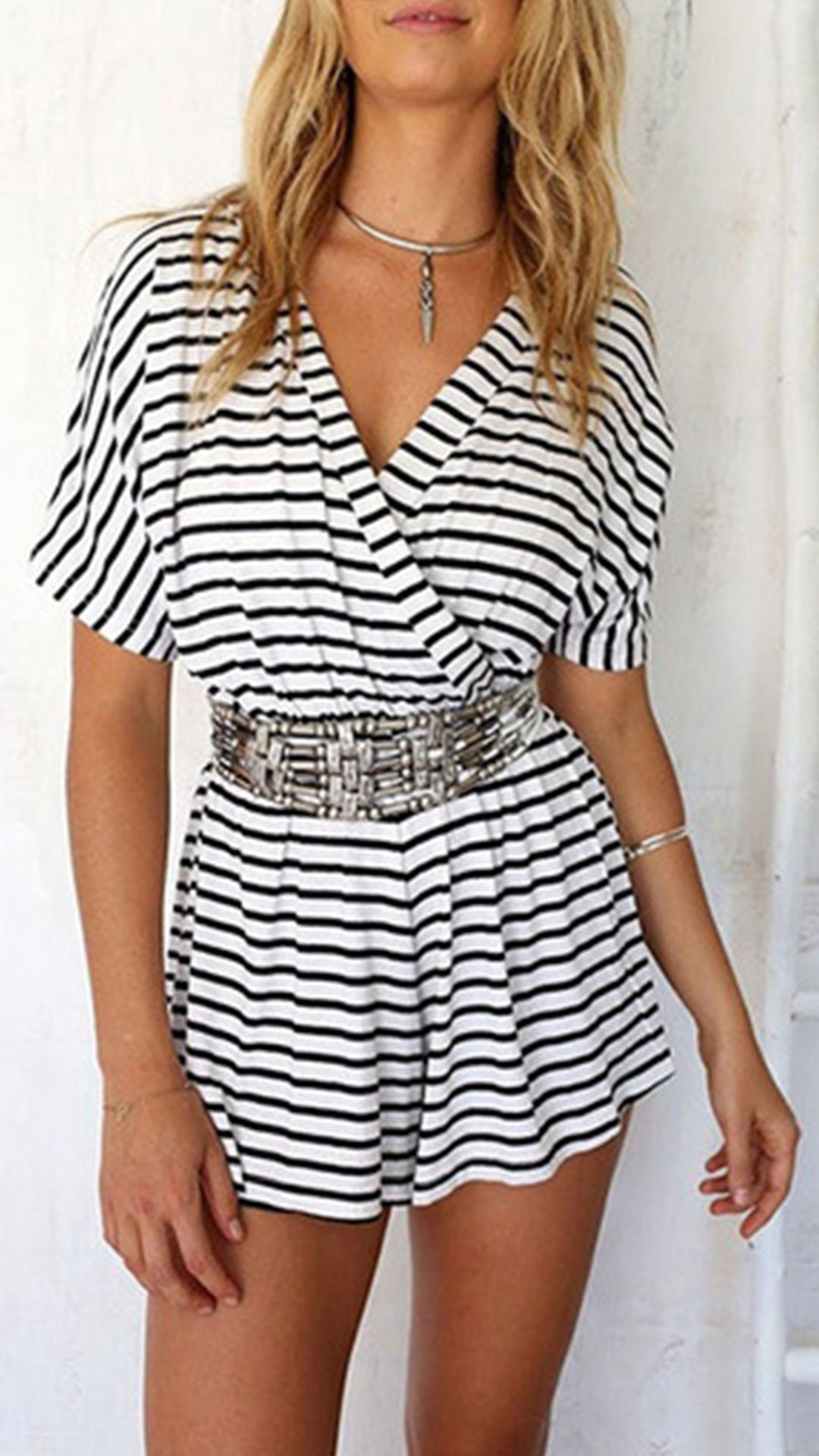 Casual Stripe Printed V-neck Short Sleeve Romper