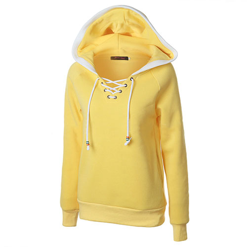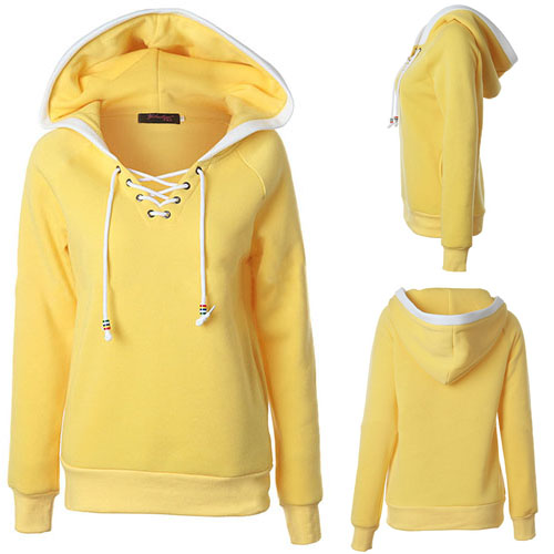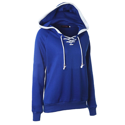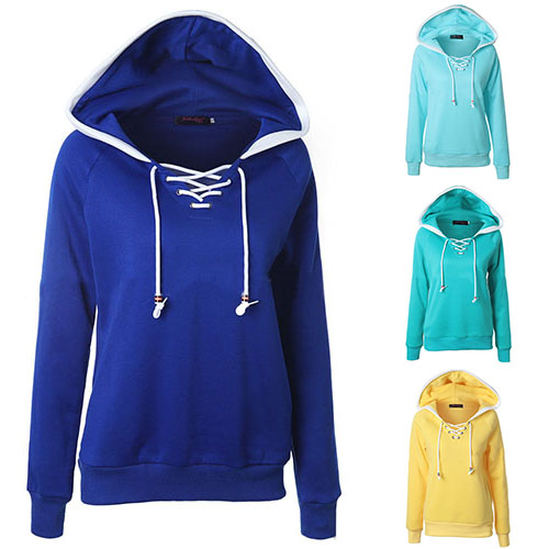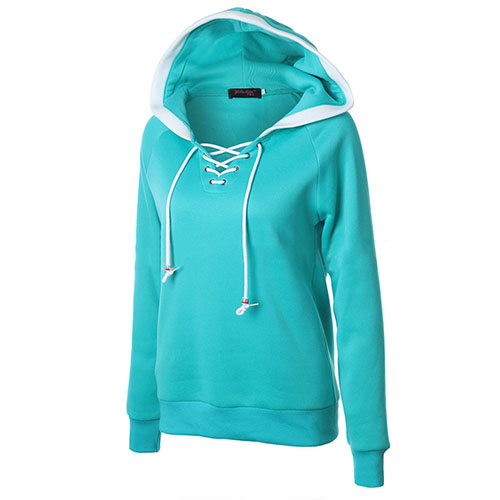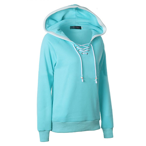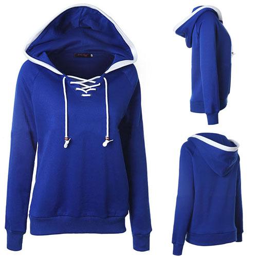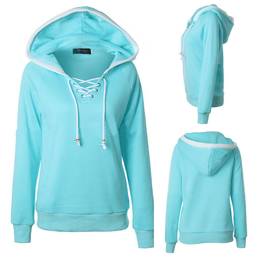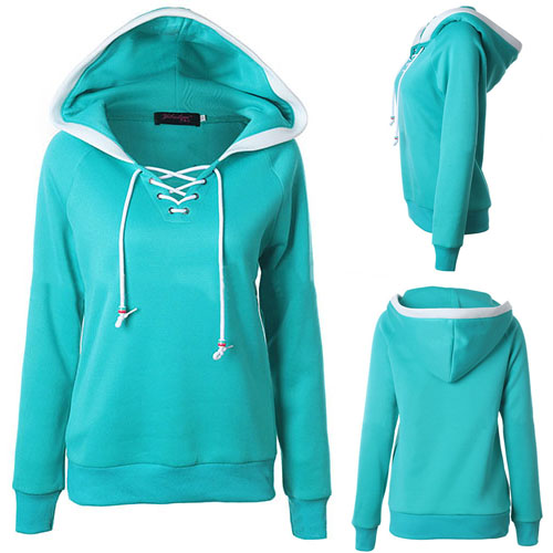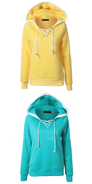 with contrast color, long sleeve and hooded design, its front lace-up creative idea makes this piece look
