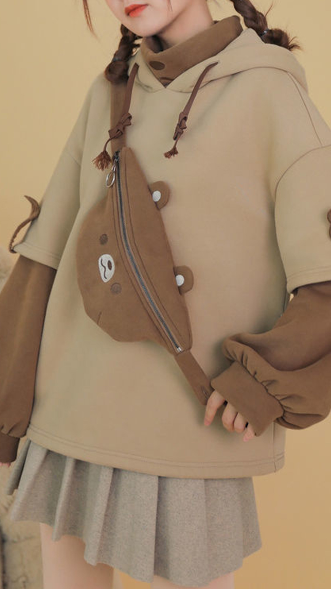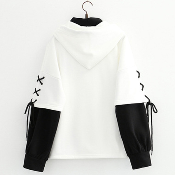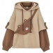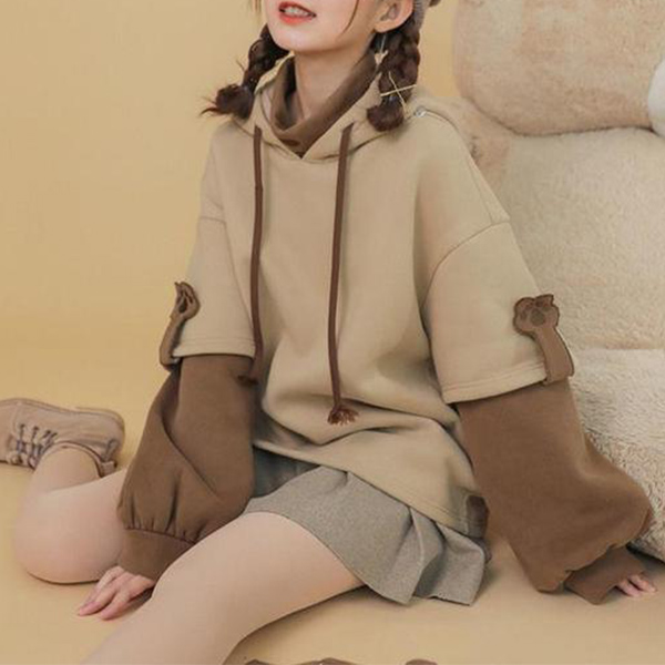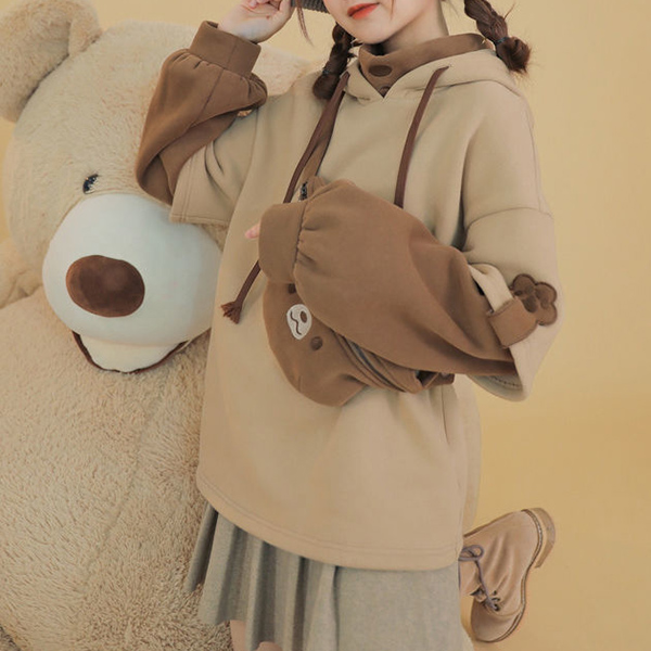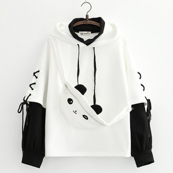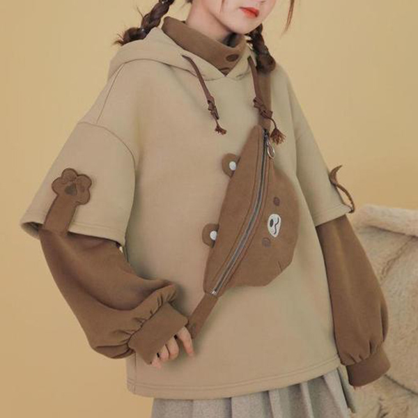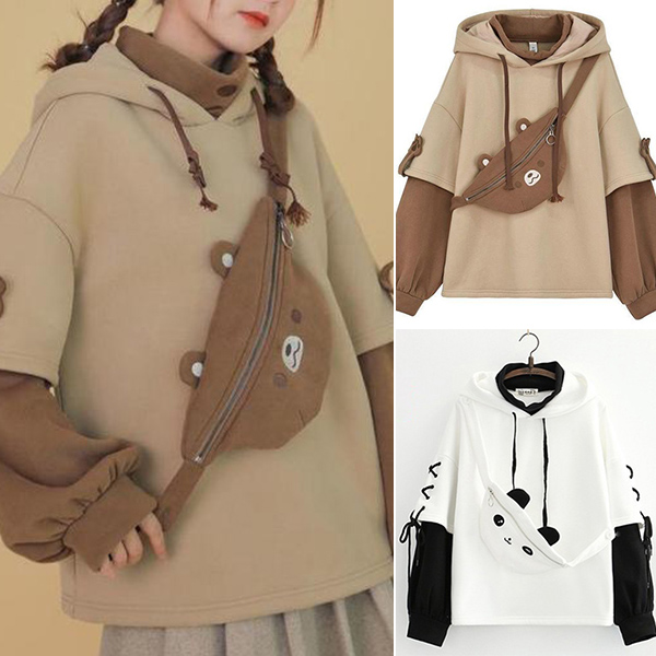 As for a casual,relaxed yet stylish daily style,you can just have a try this sweatshirt. Contrast color element and unique sleeve design make this piece look so distinctive. Mock two-piece set design will add some cute and playful sense. Comes with a lively bear bag,which can solve your matching issue. Just slip into this piece to have a wonderful day!