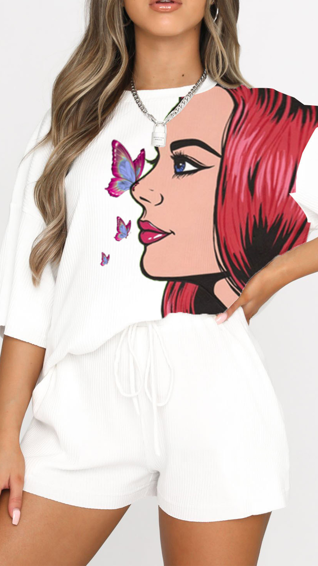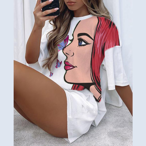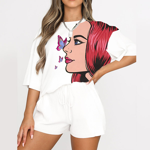 For these girls who have no time to do the daily matching,then these two-piece set can be your perfect solution. Including a half sleeve round neck loose t-shirt and high waist slim fit shorts,this two-piece set can keep the comfy as well as exude your style and personality. And the girl pattern design will help you catch more eyes. Your perfect choice in these summer days.
