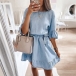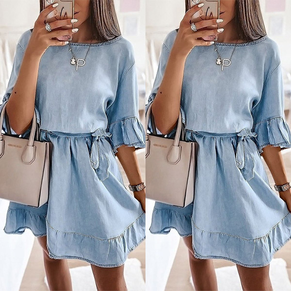 Casual Style Half Sleeve Round Neck Ruffle Hem Tie-belt Dress