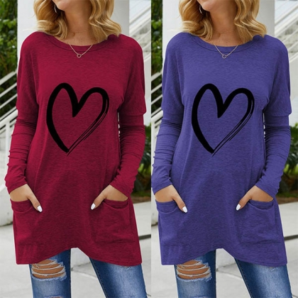 Casual Style Heart Printed Long Sleeve Round Neck T-shirt