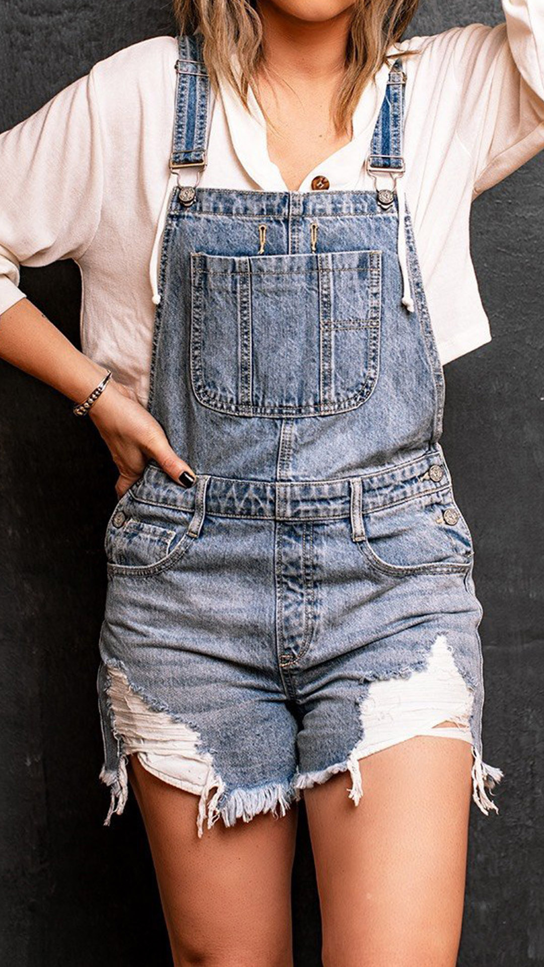 Casual Style High Waist Ripped Denim Shorts Overalls