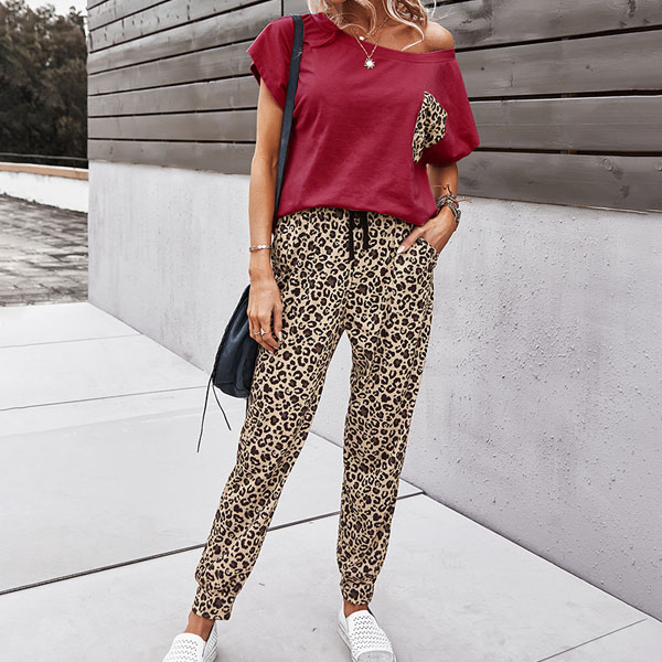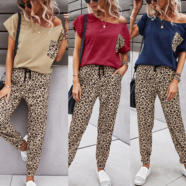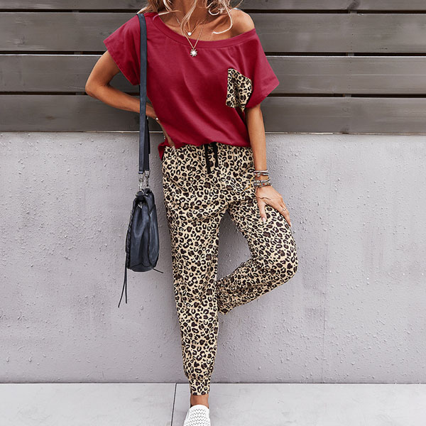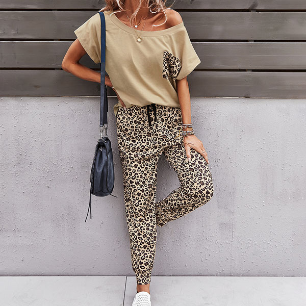 For your casual time and off-duty days,this two-piece set can easily strike your mind. The leopard printed details make it look so eye-catching and attractive. Including a short sleeve round neck t-shirt and a pants,this two-piece set can give you an all-day comfort with its soft and breathable fabric.