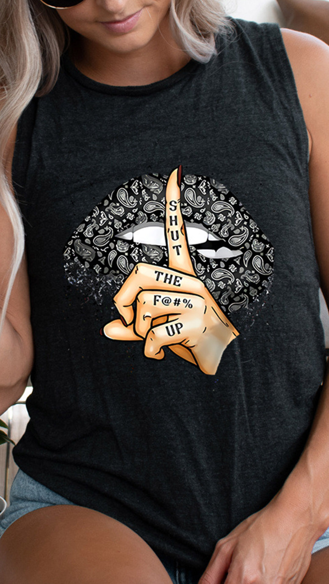 For these hot summer days,a cozy yet stylish tank top is an essential. So how about this piece? Crafted form soft and breathable fabric,with sleeveless and round neck design,which can give you a cool and comfortable day. And the chic lip pattern design will add some playful vibes. Try to match with a shorts to enjoy your summer days.