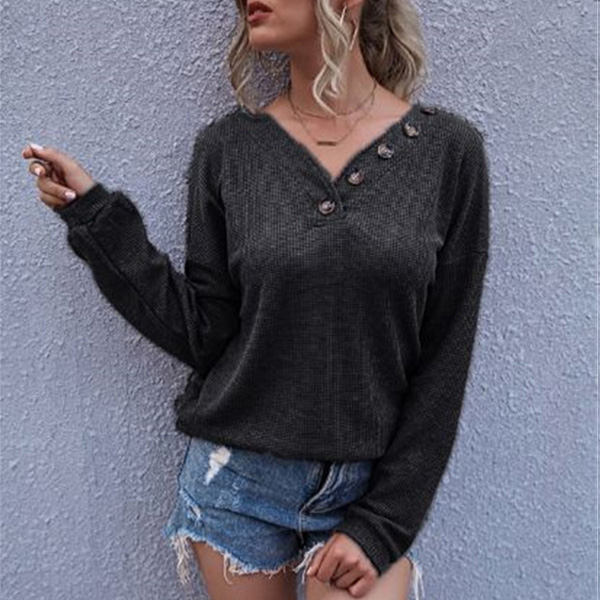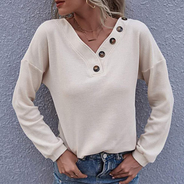 Casual Style Long Sleeve Button V-neck Loose T-shirt