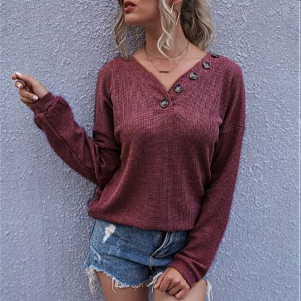Your casual days call for a laid-back and relaxed piece,so we suggest you choosing this t-shirt. The v-shape neckline with button details will enrich the design style as well as enhance your feminine appeal,while its soft,breathable fabric and loose silhouette design can give you a long-lasting comfort. For these early autumn days,this piece would be your wise choice.