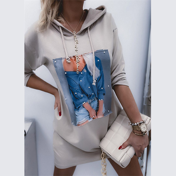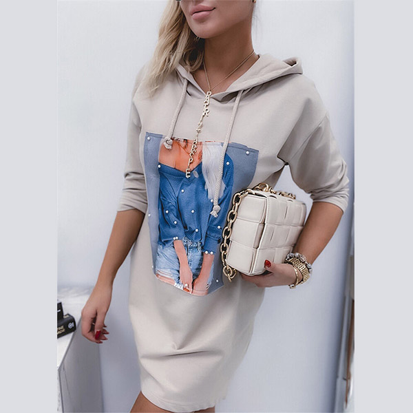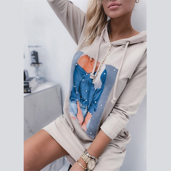 Casual Style Long Sleeve Hooded Printed Sweatshirt Dress