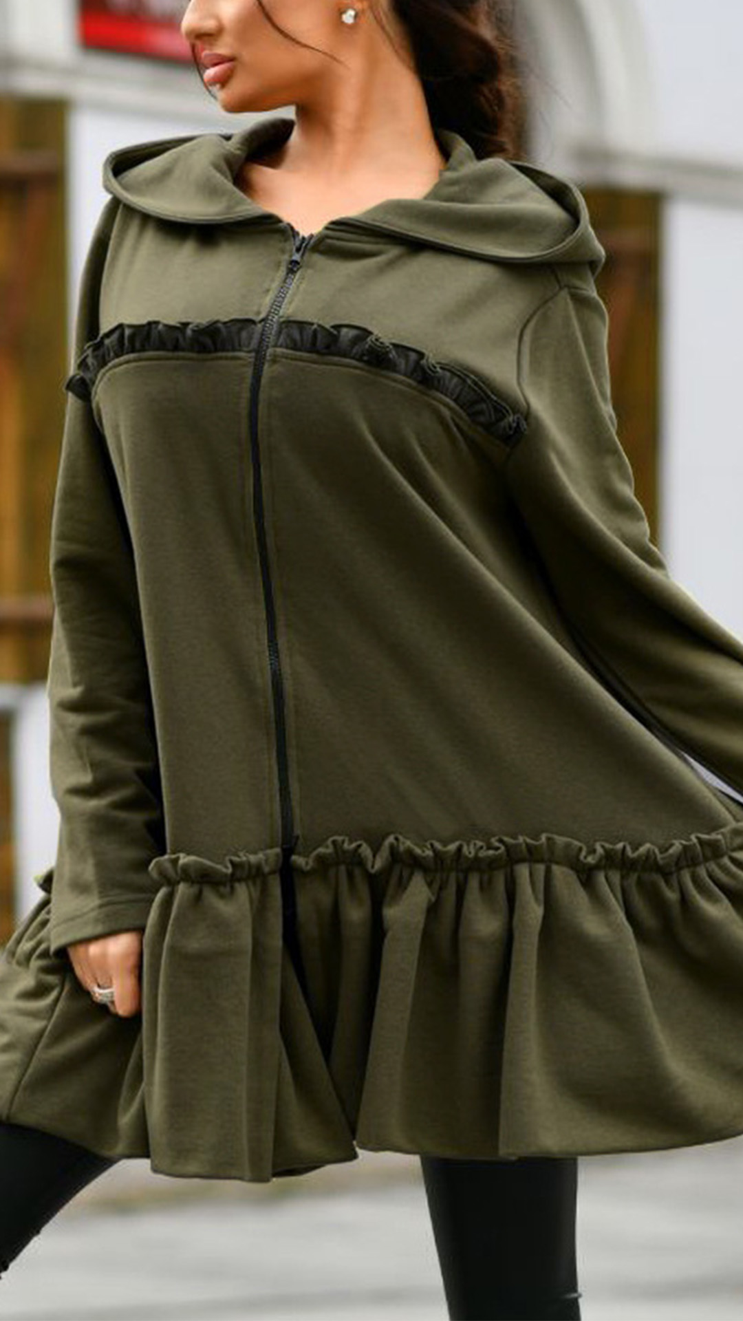 For your autumn and winter days,this cozy yet stylish sweatshirt coat can be your perfect choice. Comes with a solid color,the front-zipper closure design makes it easy to wear and off,while the ruffle hem design is the highlight,which can lend you a dash of sweet yet stylish vibes. You can match it with your tight pants and ankle boots for a laid-back but fashionable look.