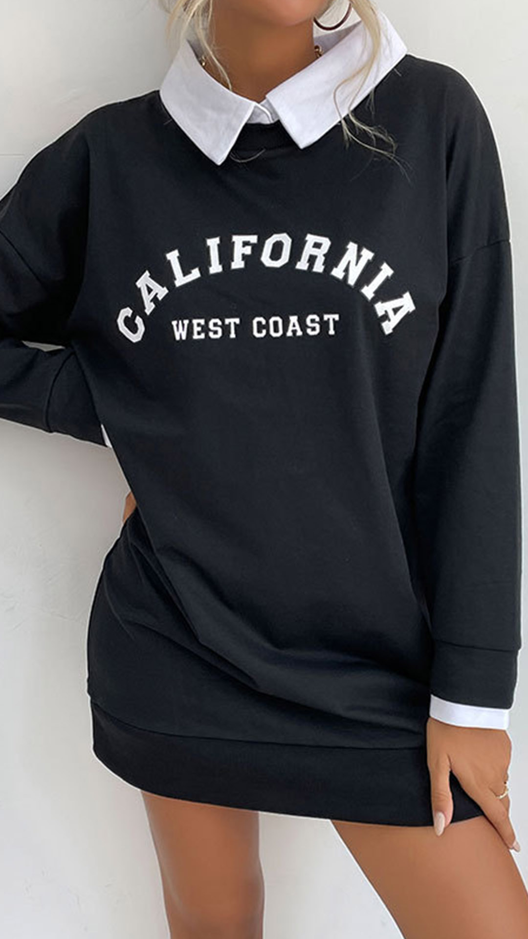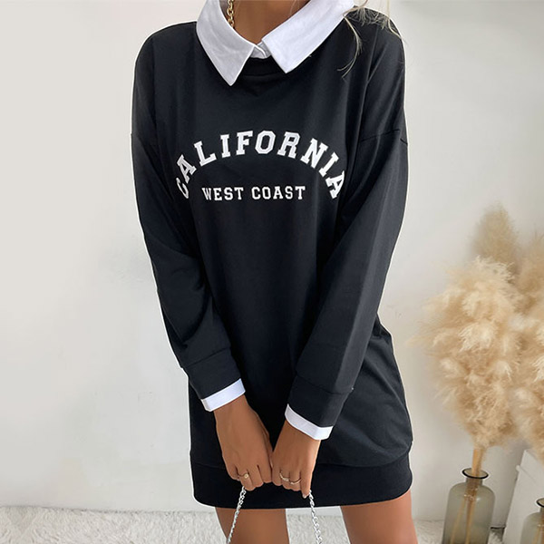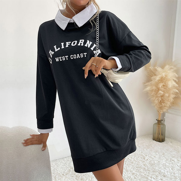 Compared with your other classic sweatshirt dress,this piece can bring you more style. Mock two-piece style makes it look so chic and unique,while the letters printed details will add some more charm. Crafted from soft and breathable fabric,this long sleeve sweatshirt is perfect fit for your autumn days.