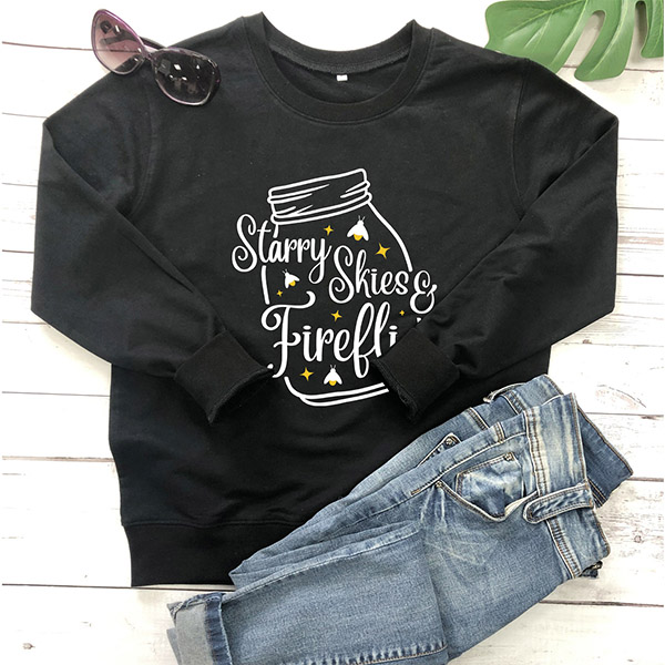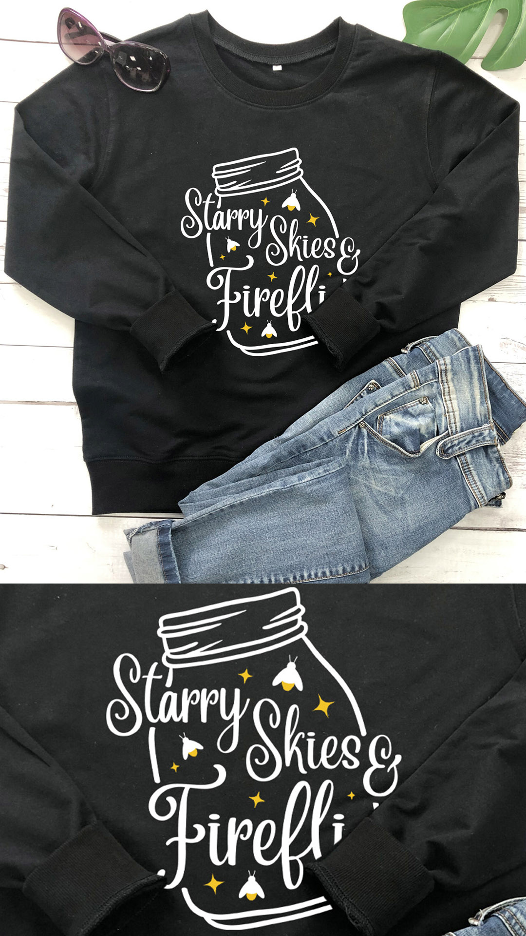 As for a laid-back and fashionable autumn look,you can just have a look at this sweatshirt. The letters and fireflies printed pattern design make it look more attractive. Crafted from soft and breathable fabric,with long sleeve,round neck and a loose silhouette,this piece also can give you an all-day comfort.