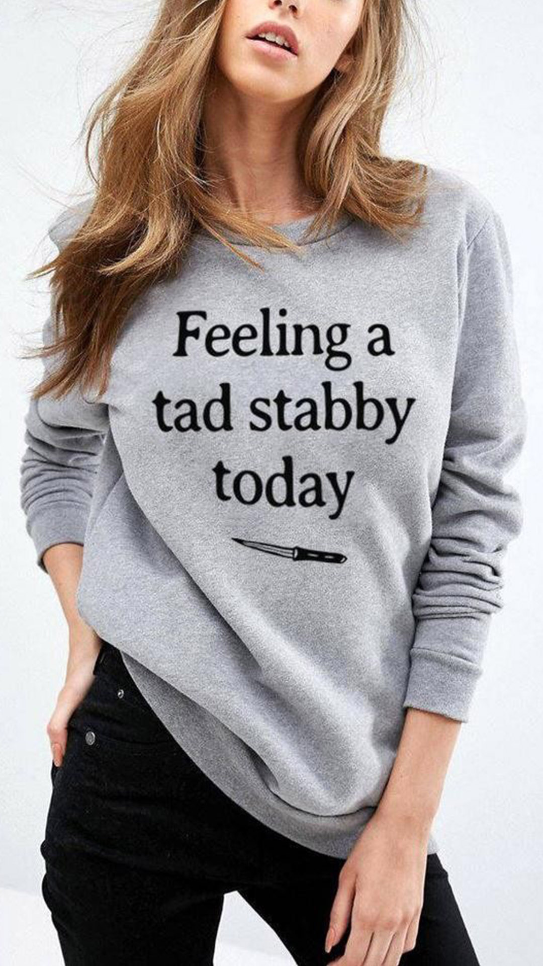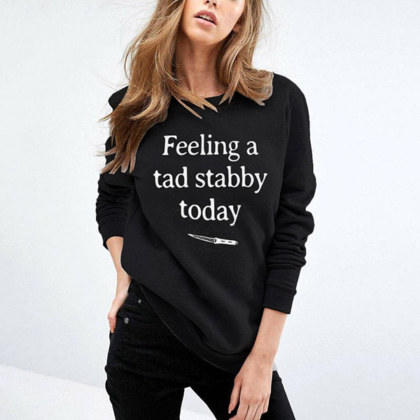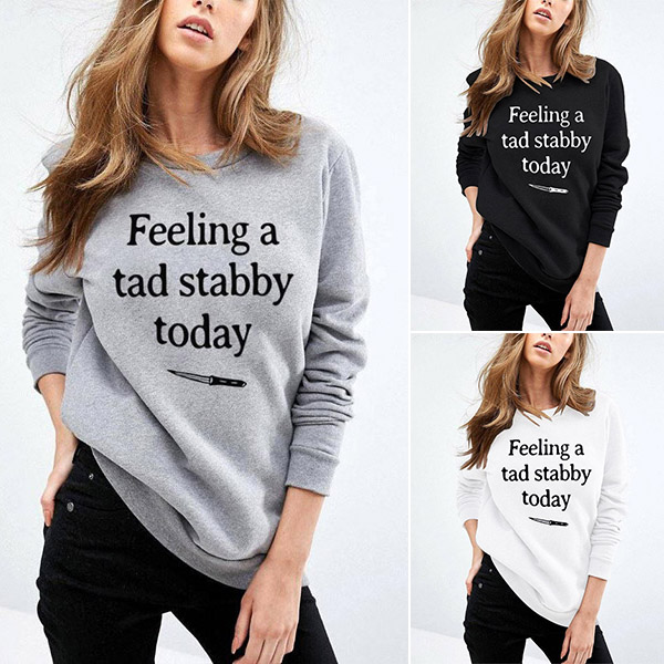 As the perfect addition for a casual,relaxed autumn look,this sweatshirt is worth for your investment. The letters printed details like "Feeling a tad stabby today" make this piece look more stylish. Crafted from soft and breathable fabric,with long sleeve,round neck and a loose silhouette,this sweatshirt also can give you an all-day comfort.