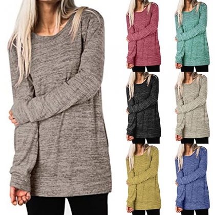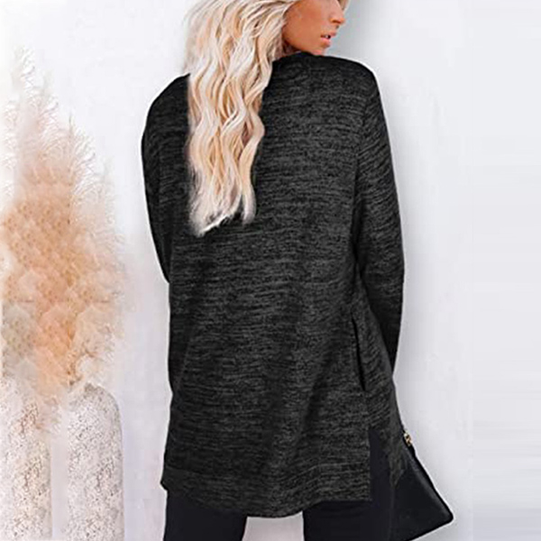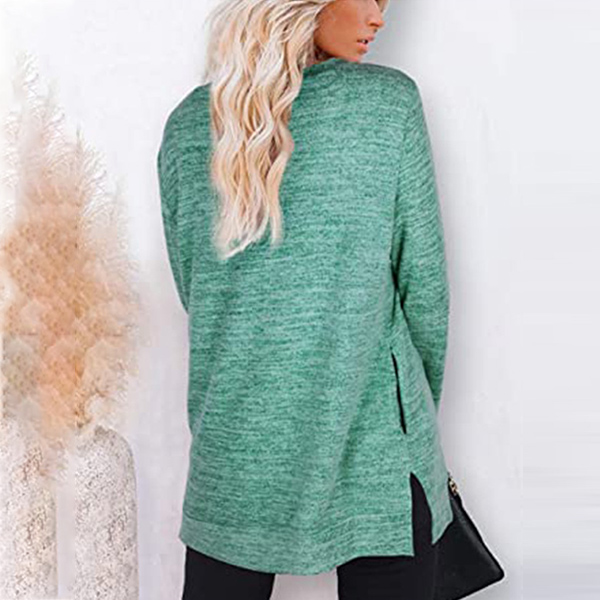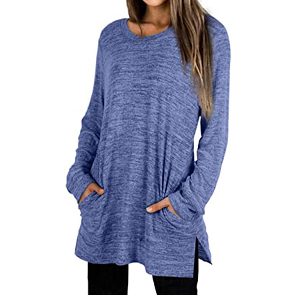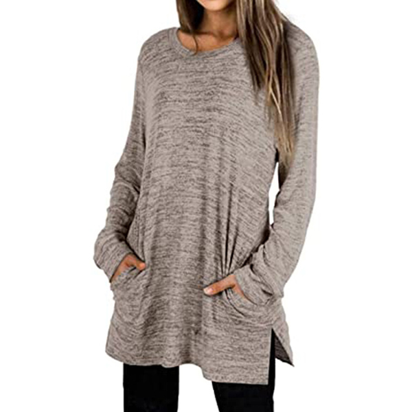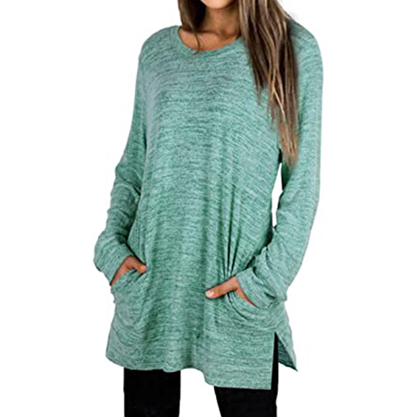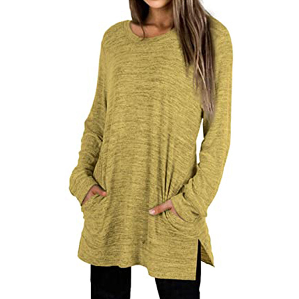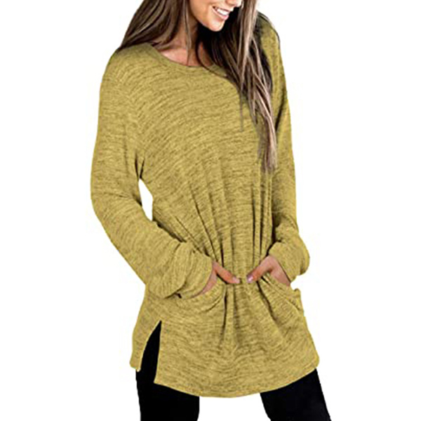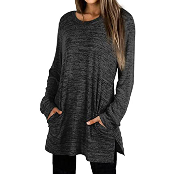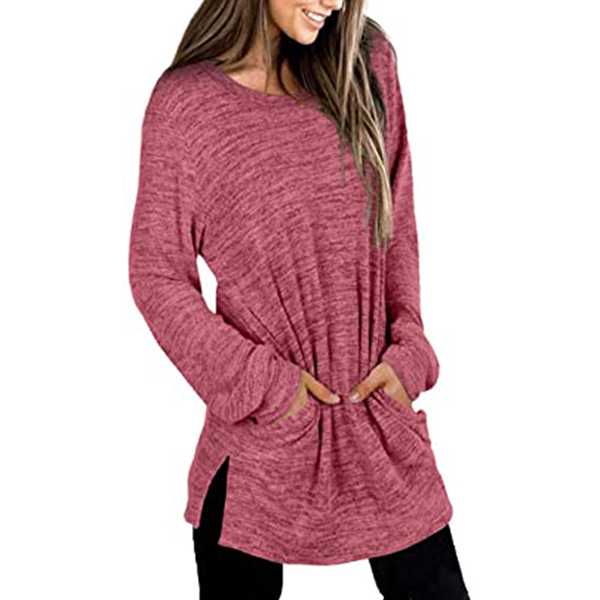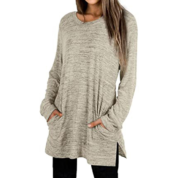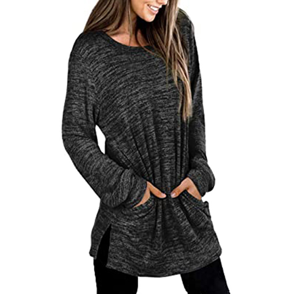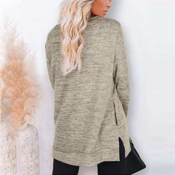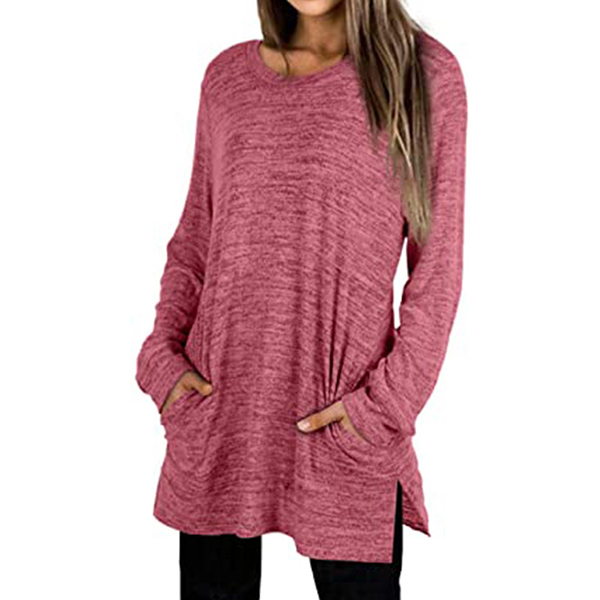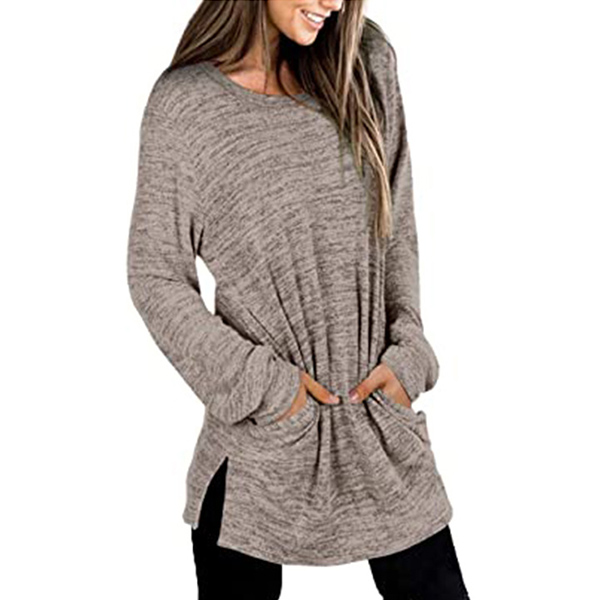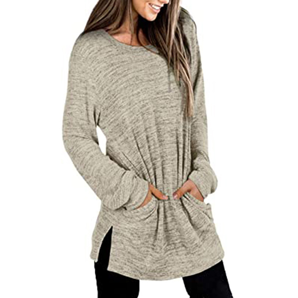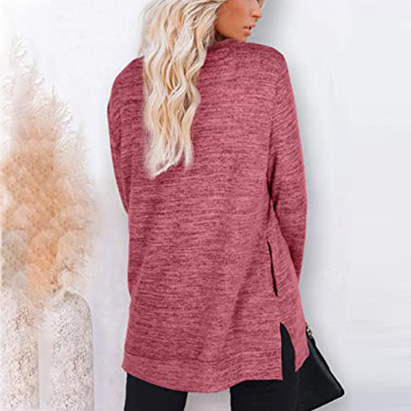 Casual Style Long Sleeve Round Neck Slit Hem Front-pocket Loose Sweatshirt