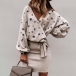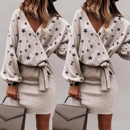 Casual Style Long Sleeve Star Printed V-neck Lace Up Dress