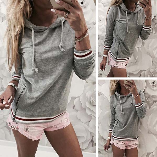 design style like long sleeve,hooded silhouette and unique details like striped spliced and zipper hem