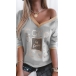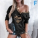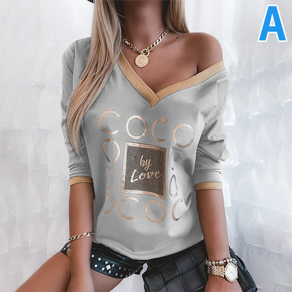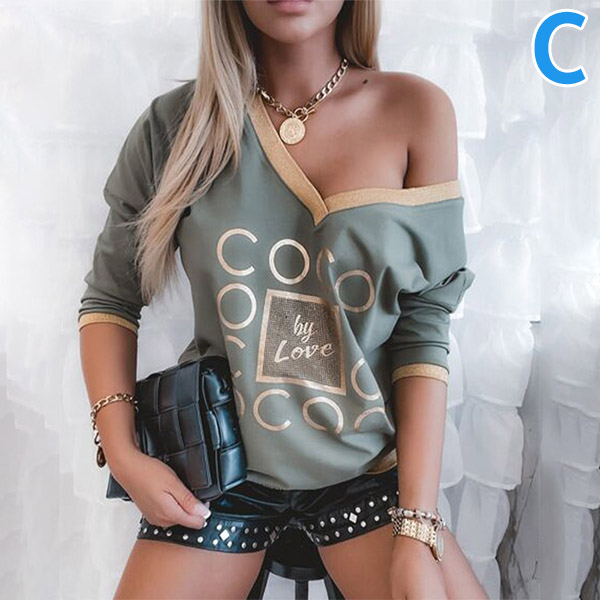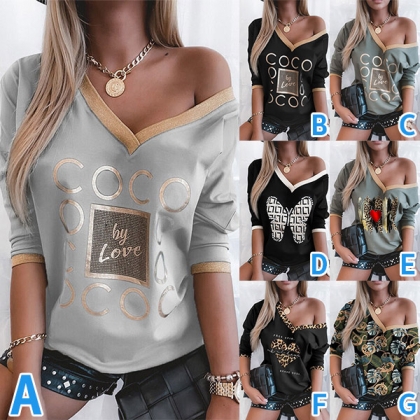 Casual Style Long Sleeve V-neck Contrast Color Printed T-shirt