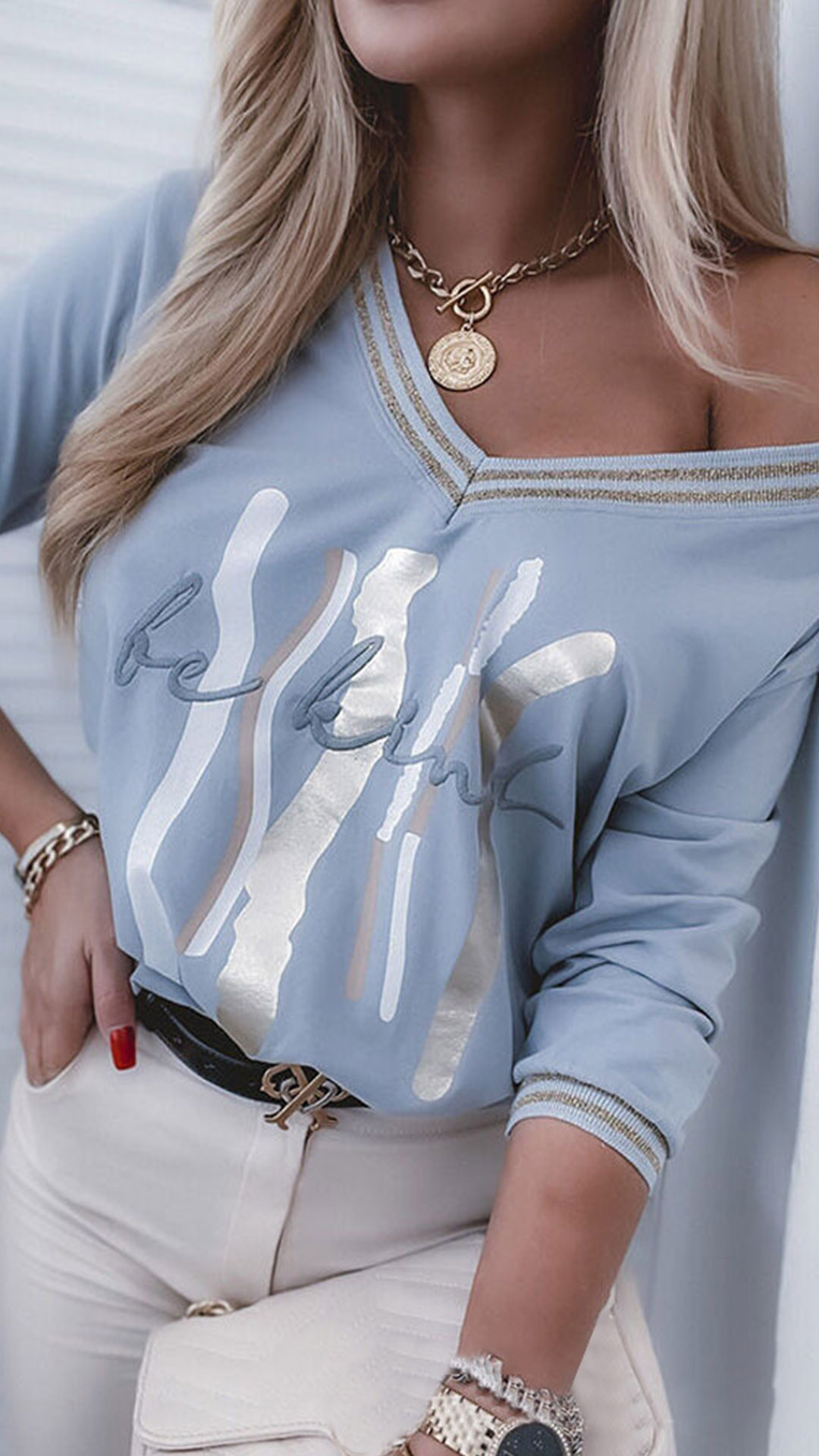 Your casual days call for a cozy yet stylish t-shirt such as this creation. Crafted from soft and breathable fabric,with long sleeve and v-neck design,this piece knows how to give you a comfortable day. Another design highlight is that this piece allows to be matched with different style bottoms.