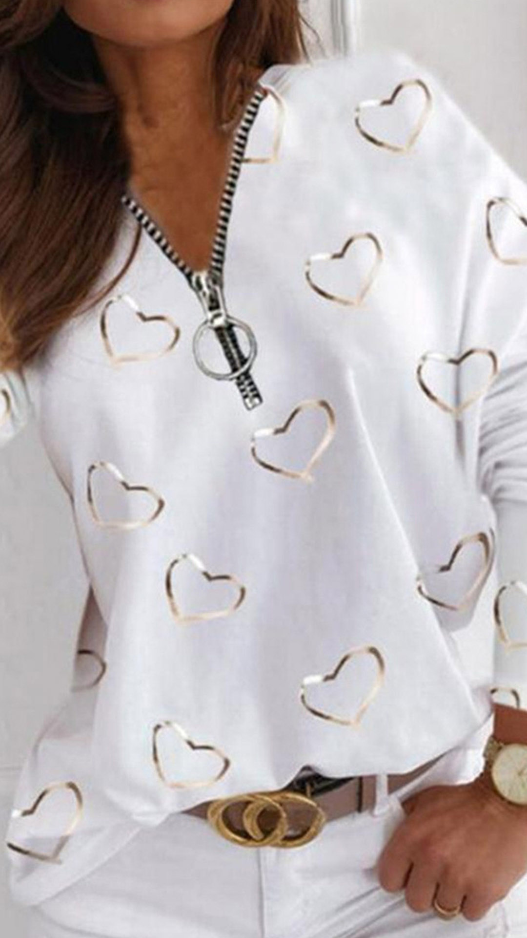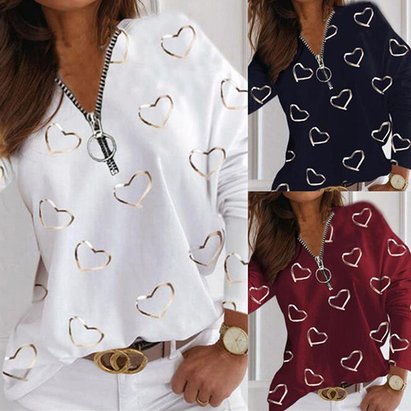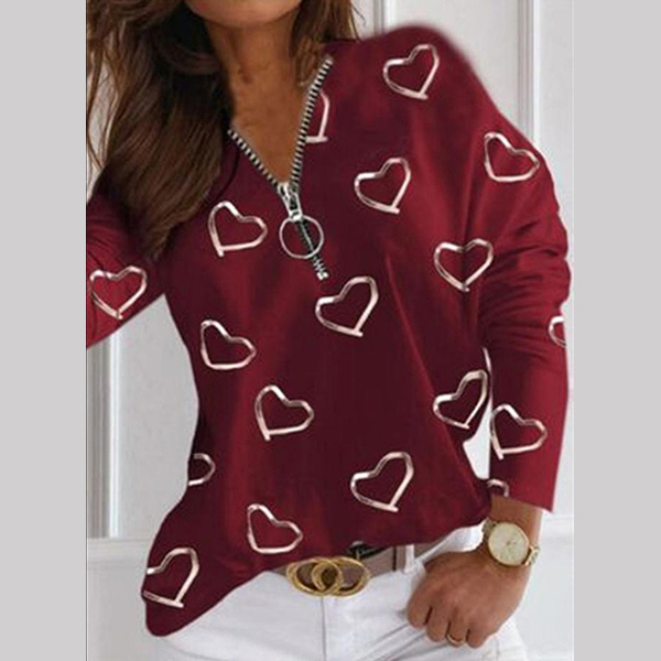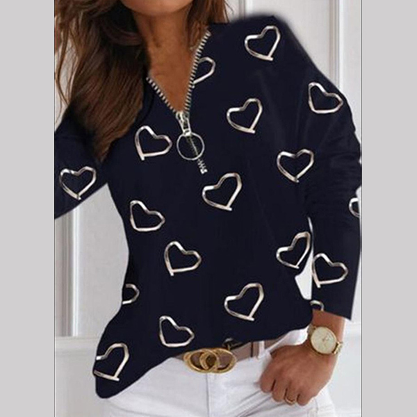 What makes this t-shirt look so stylish and attractive? It owes to the heart printed pattern. And the zipper v-neck design will further enhance its charm. Crafted from soft and breathable fabric,with long sleeve and a loose silhouette,this t-shirt would promise you an all-day comfort. A good choice for you on these casual days.