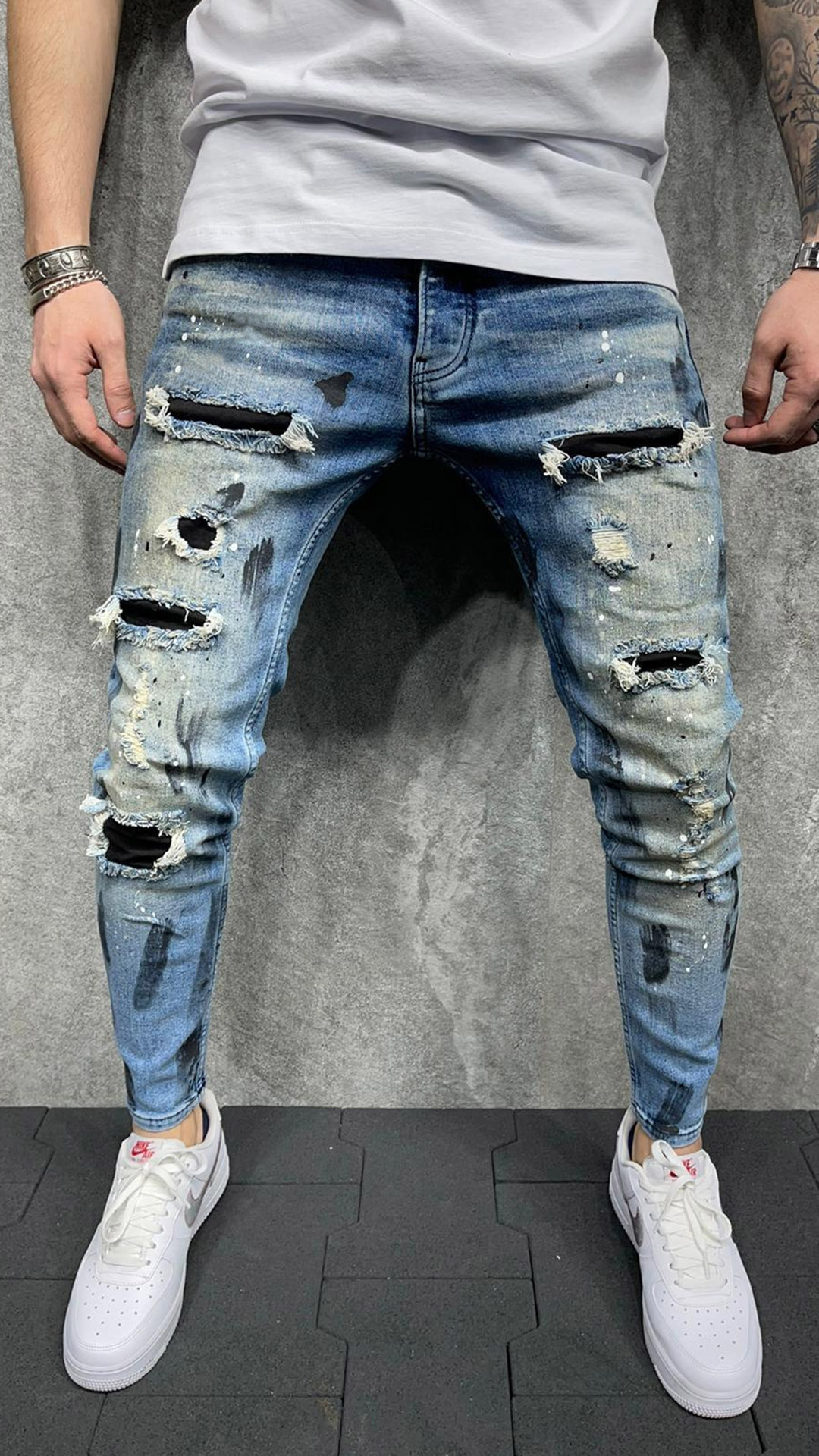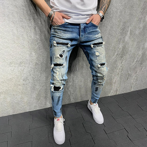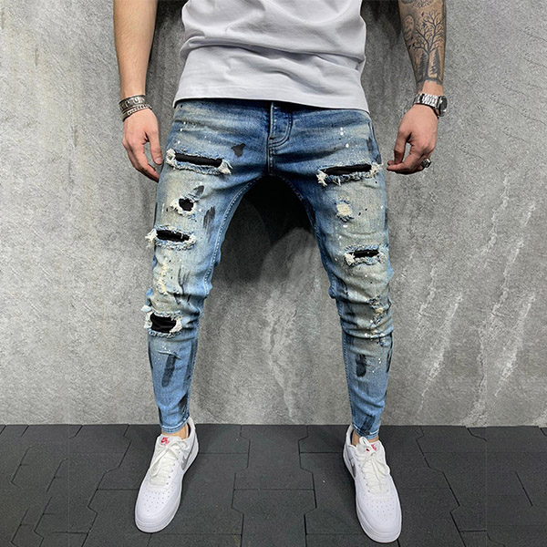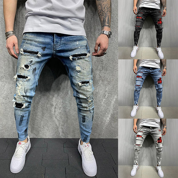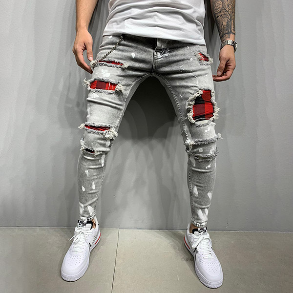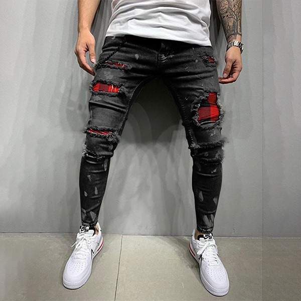 During your off-duty days and casual weekends,this jeans can be your perfect addition for a casual,relaxed yet stylish daily style. What makes this piece look so attractive? It owes to the ripped and plaid spliced details. You can simple match with your favourite t-shirt to achieve for a handsome and fashionable dress up.