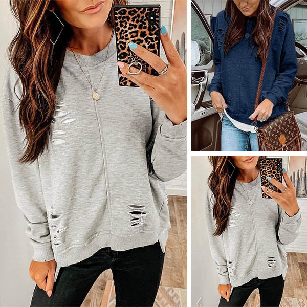 long sleeve, irregular hem, come with ripped detail at the front, slip into tight-fitting pants to complete a trendy