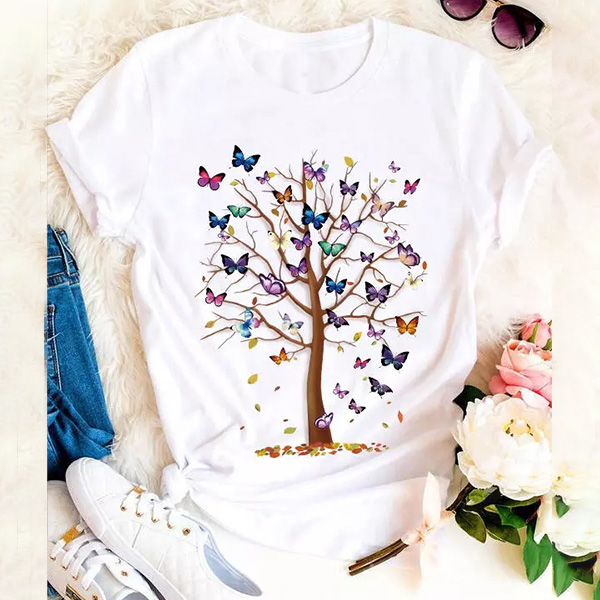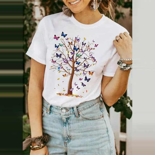 As for your casual days,this t-shirt is just the thing you need. Crafted from soft and breathable fabric,with short sleeve and round neck design,this simple,classic t-shirt can give you an all-day comfort. Moreover,the butterfly tree printed pattern design will make this piece full of vivid and playful vibes. You can match it any kind ob bottoms you like to enjoy your casual days.