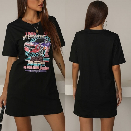 Casual Style Short Sleeve Round Neck Car Pattern T-shirt Dress