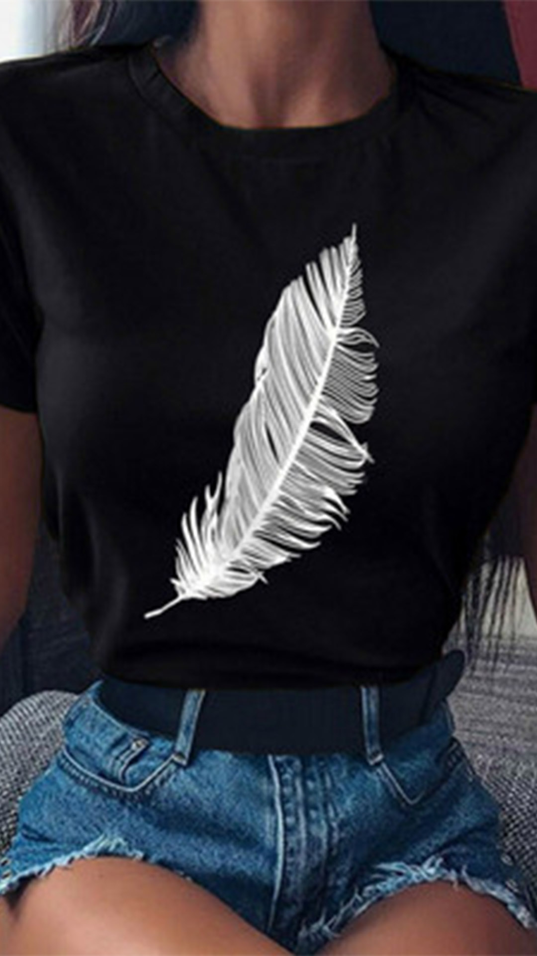Casual Style Short Sleeve Round Neck Feather Printed T-shirt