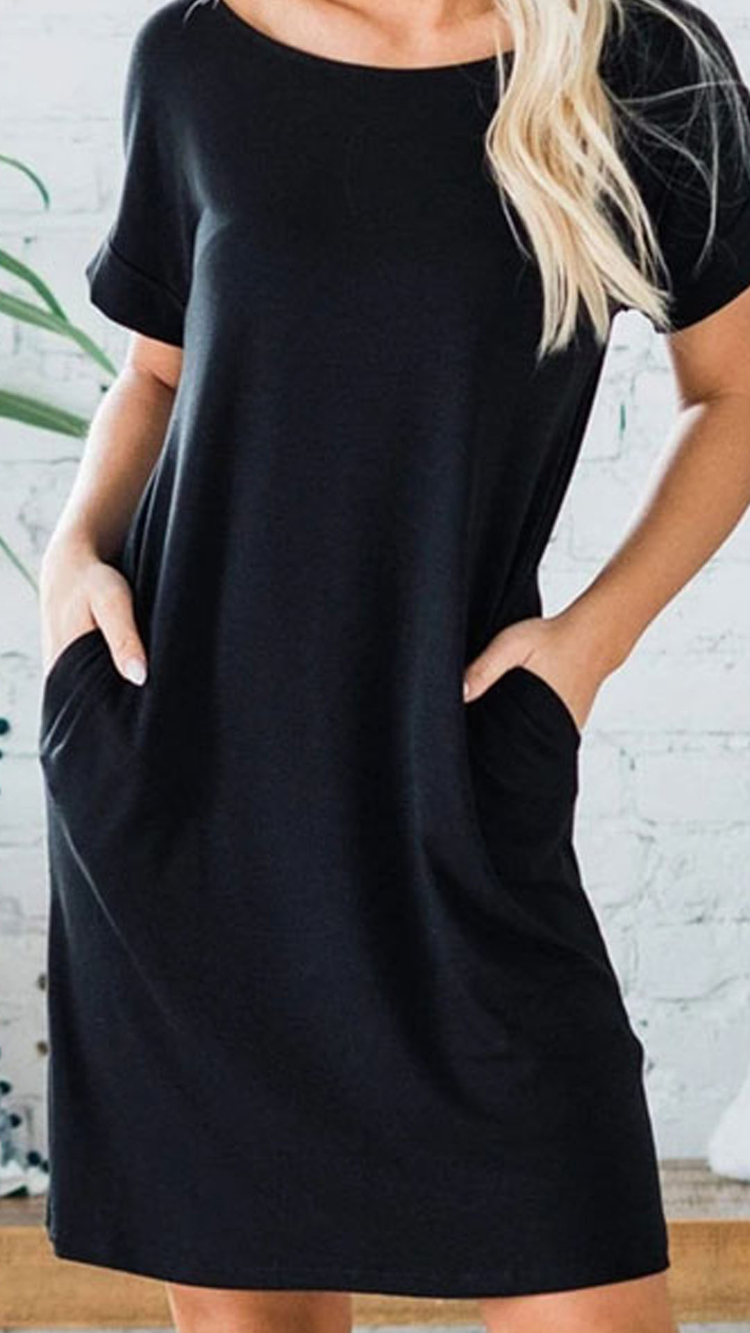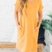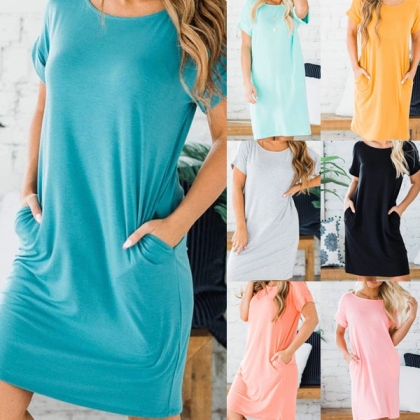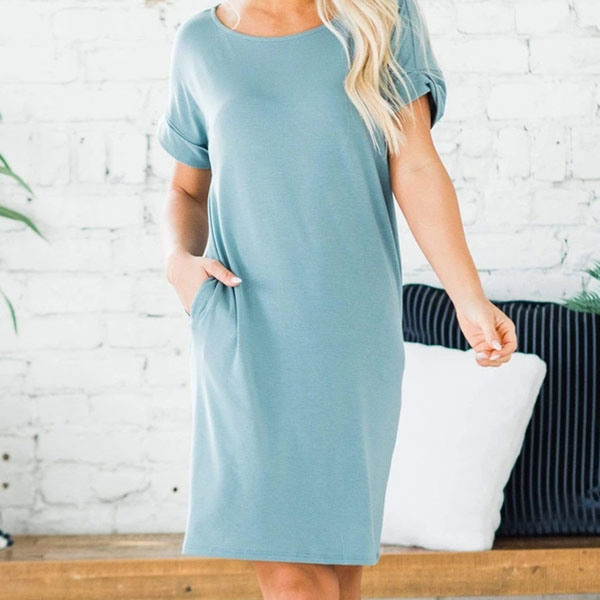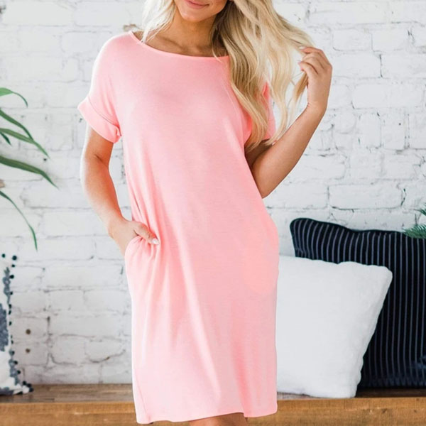 On your lazy days when you don't know what to wear,then you can just slip into this t-shirt dress. Crafted in a solid color,with short sleeve,round neck and a loose silhouette,this simple,classic style dress can ensure you an all-day comfort. And the slanted pocket design will add some casual vibes. Just match it with your causal shoes to enjoy your off-duty days and casual time.