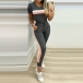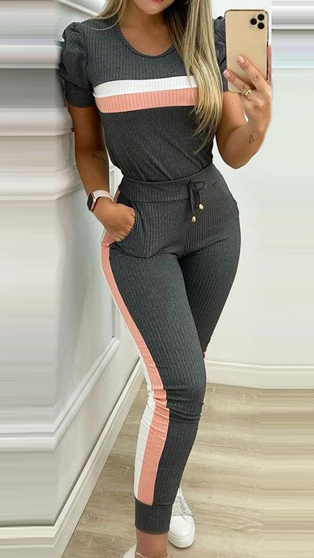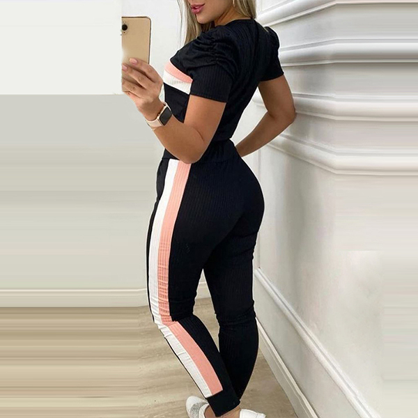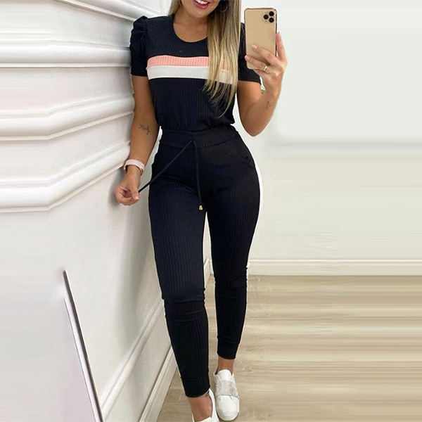 For the sports lover girls,a cozy yet stylish sports suit is an essential. So how about this set? Contrast color design makes it look not so simple and dull. Including a short sleeve round neck t-shirt and a pants,crafted from soft and breathable fabric,this two-piece set can give you a comfortable day. Perfect fit for your sports time and casual weekends.