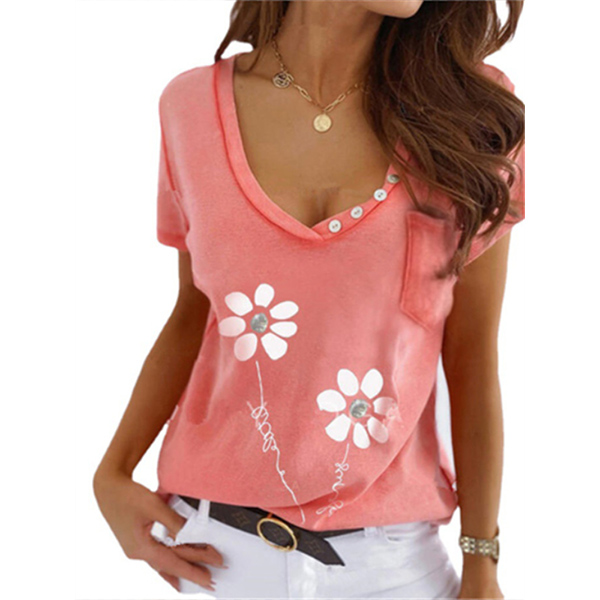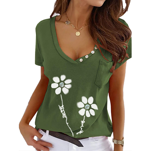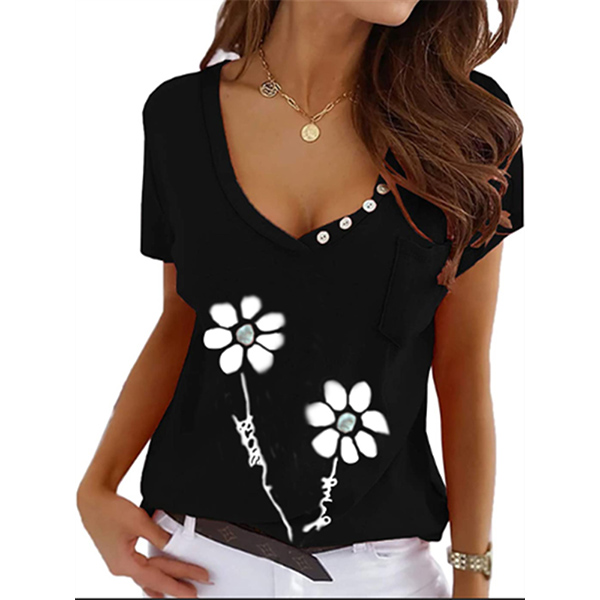 Casual Style Short Sleeve V-neck Flower Printed T-shirt