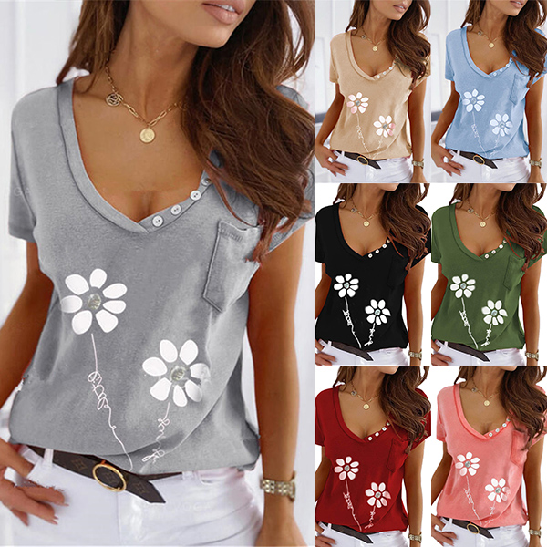 For every girl,a cozy,stylish and all-match t-shirt is an essential. So what are you waiting for if you still not have one? The flower pattern design break the simple and dull design style. Crafted from soft and breathable fabric,with short sleeve and v-neck design,this piece not only can keep the comfy,but also can offer you different matching styles.