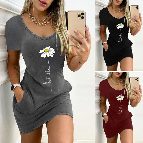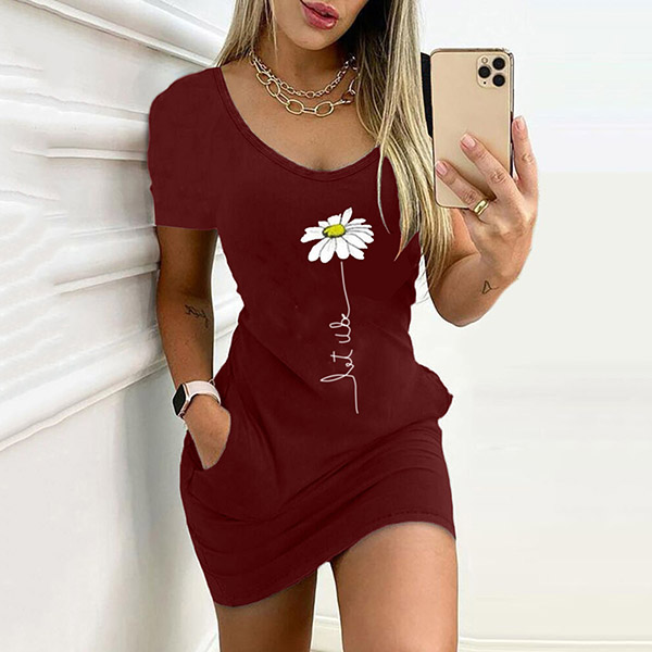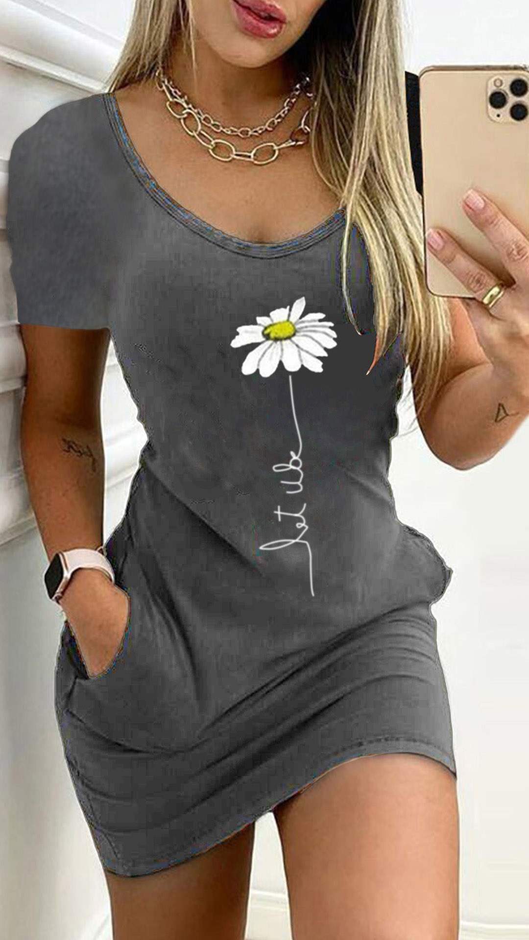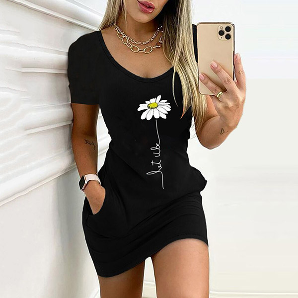 Casual Style Short Sleeve V-neck Front-pocket Slim Fit Printed Dress