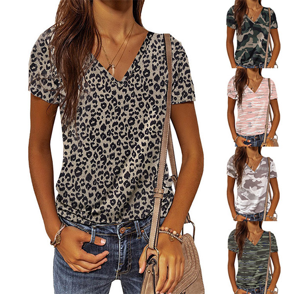 Combines of cozy,stylish and all-match vibes,this t-shirt is yearning for a place in your wardrobe. The camouflage/leopard printed details make this piece look so eye-catching and stylish. Crafted from soft and breathable fabric,with short sleeve and v-neck design,this t-shirt not only cna keep the comfy,but also can offer you different matching opportunities.
