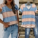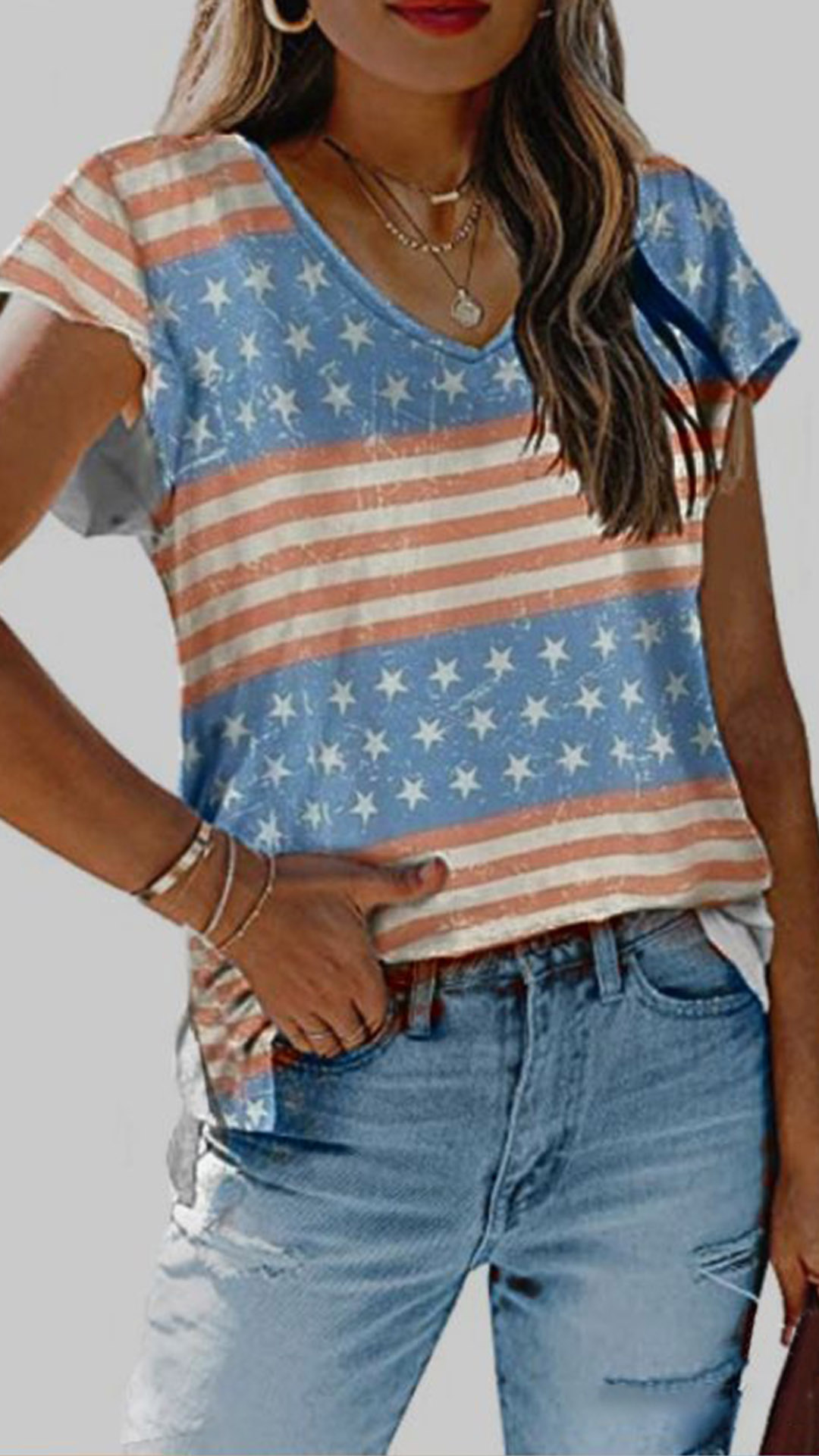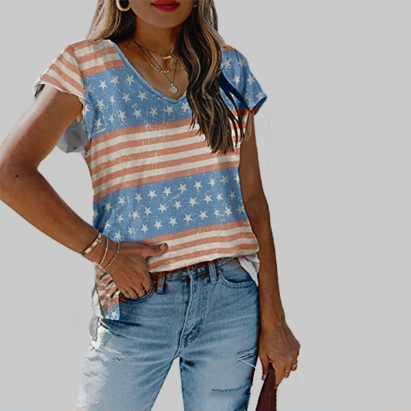 Casual Style Short Sleeve V-neck Star Stripe Printed Loose T-shirt