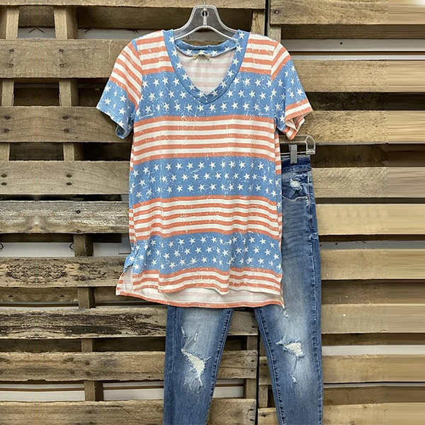When it comes to a casual,relaxed yet stylish daily style,you can just have a look at this t-shirt. Combines of star and stripe element,which make this piece look more stylish and eye-catching. Crafted from soft and breathable fabric,with short sleeve,v-neck and a loose silhouette,this piece not only can give you a comfortable day,but also can offer you different matching styles.