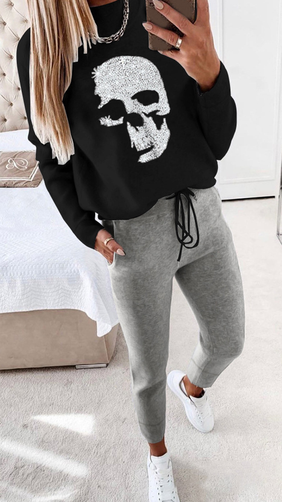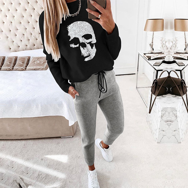 Casual Style Skull Head Pattern Sweatshirt + Pants Two-piece Set