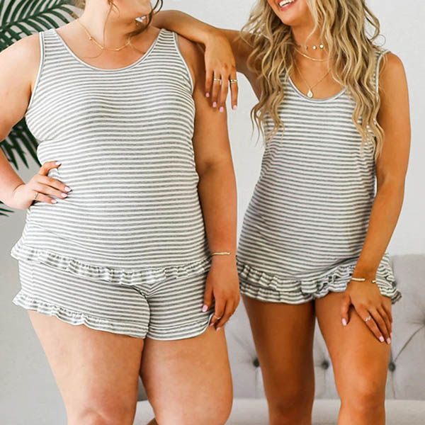 Casual Style Sleeveless Round Neck Ruffle Stripe Top + Shorts Home-wear Set
