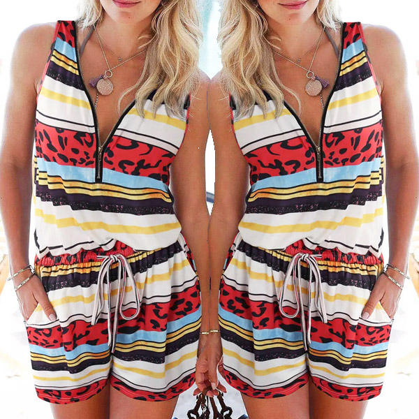 If you're in search for a piece that can easily upgrade your style,then look no further than this romper! The leopard and stripe element design make this piece look so eye-catching. Finished with sleeveless,zipper v-neck and drawstring waist,this romper is worth to be your wardrobe staple in these summer days.