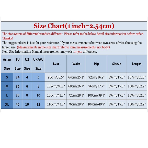 XL : Bust : 156cm(61.42"); Waist : 76cm(29.92"); Hips : 104cm(40.94"); Sleeve : 62.5cm(24.61"); Length : 161cm(63.39");