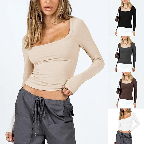 Casual Style Solid Color 3/4 Sleeve Round Neck Slim-fitting Tops