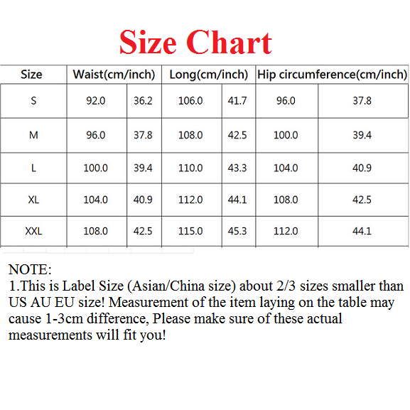 XXL : Waist : 108cm(42.52"); Hips : 112cm(44.09"); Length : 115cm(45.28");