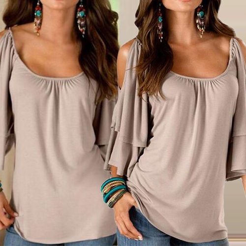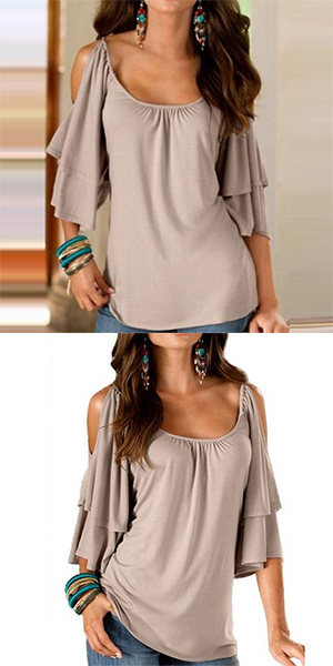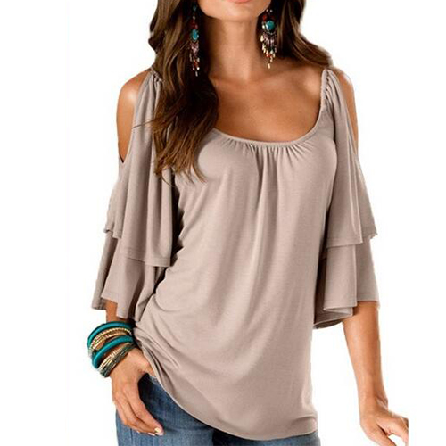 Solid color style, this T-shirt features round neck, cold shoulder and ruffle sleeve design, casual,