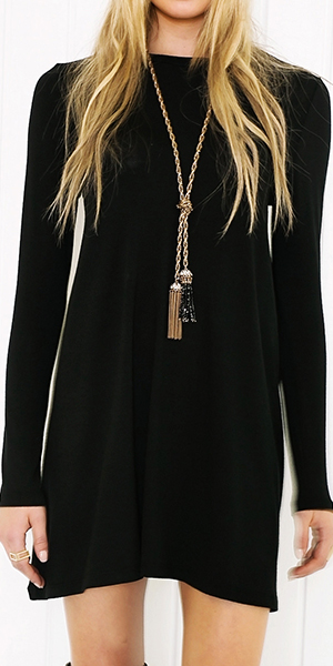 This dress is splashed in black hue that makes it easy to pair with your wardrobe. Round neck and long