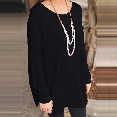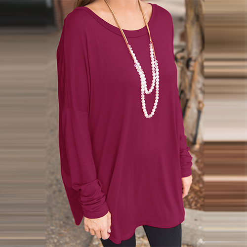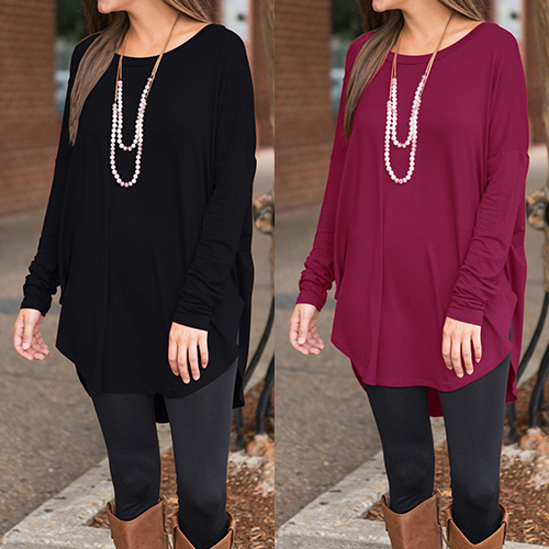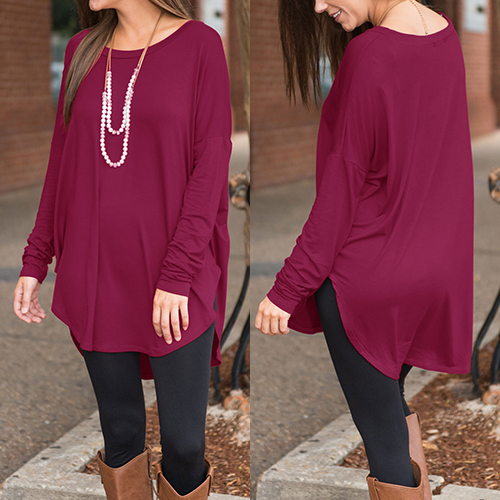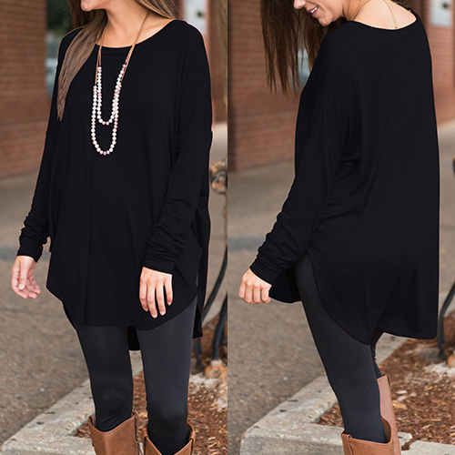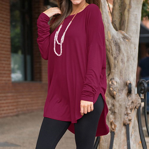Casual Style Solid Color Round Neck Long Sleeve Side Slit T-shirt