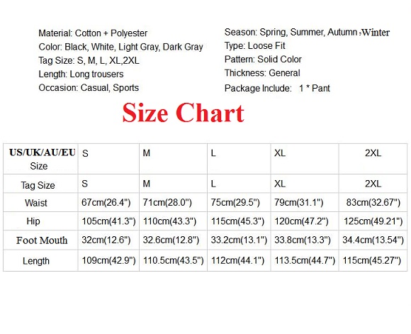 XXL : Waist : 84cm(33.07"); Hips : 125cm(49.21"); Foot Mouth : 34.6cm(13.62"); Length : 115cm(45.28");