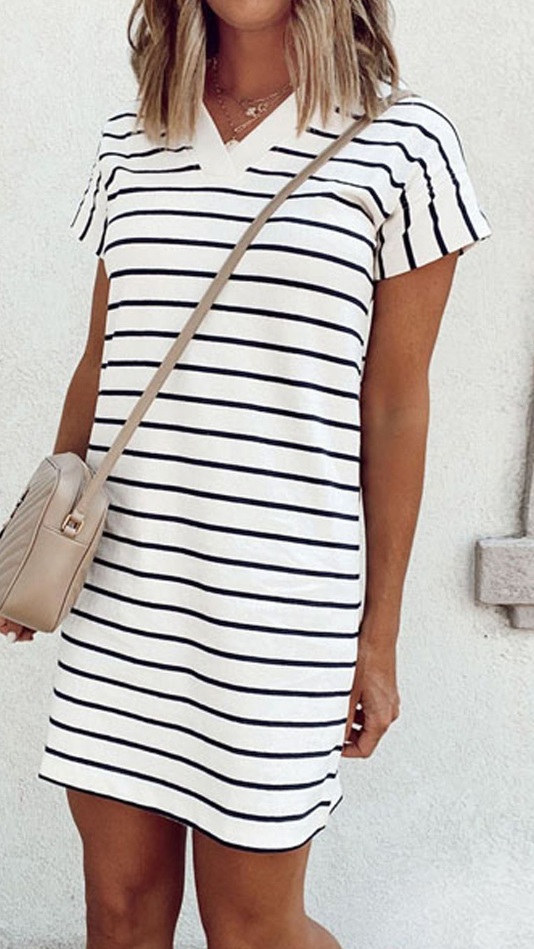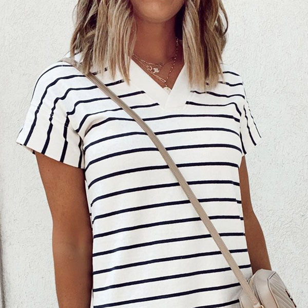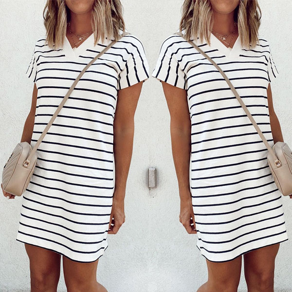 For your some rushed mornings,you call for an easy-to-wear dress. So how about this piece? The stripe element design can help you catch up with the latest fashion trend. Finished with short sleeve,v-neck and crafted from soft,breathable fabric,this dress definitely knows how to give you a cozy yet stylish daily style.