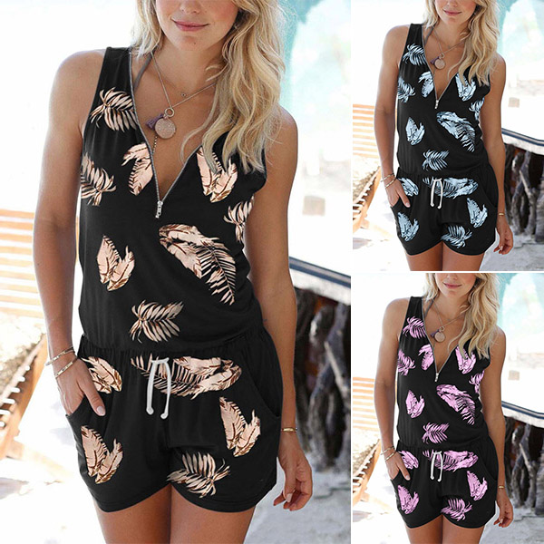 Casual Style Zipper V-neck Sleeveless Drawstring Waist Feather Printed Romper