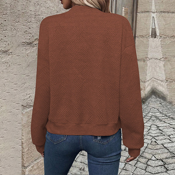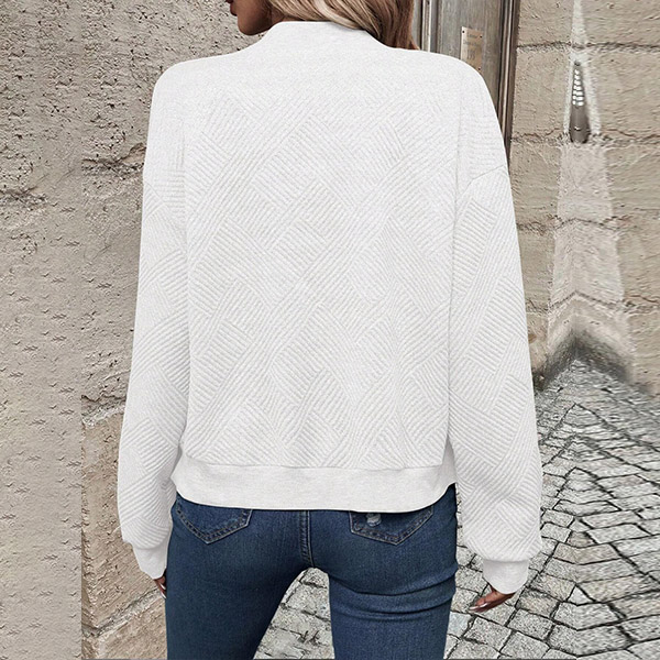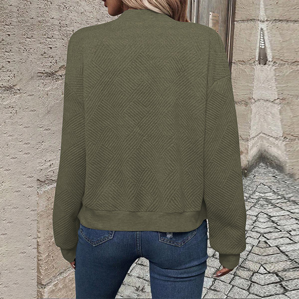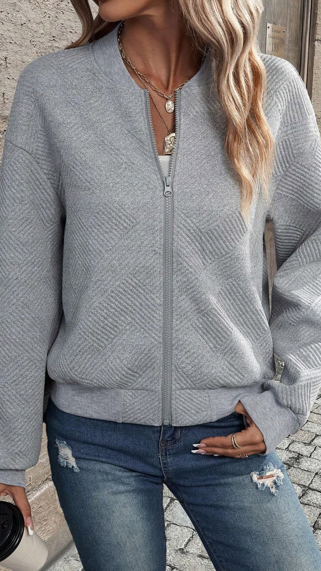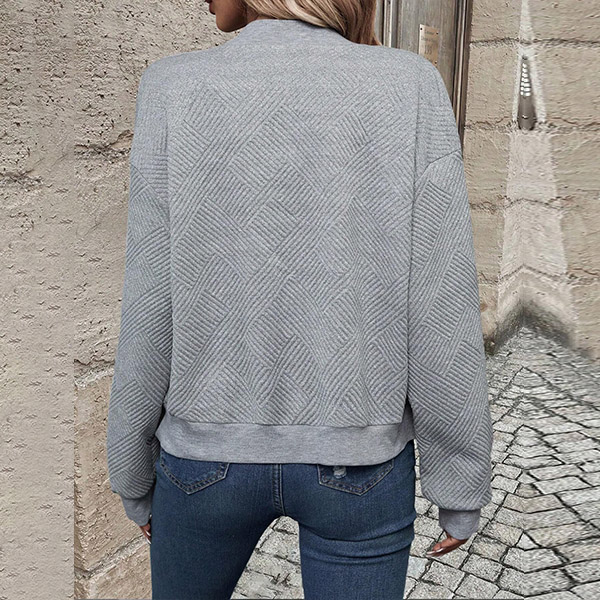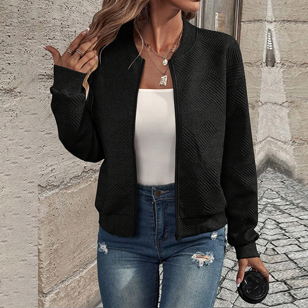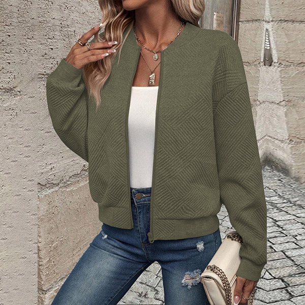 This casual baseball jacket features a textured fabric, long sleeves, and a front zipper closure, creating a sporty and stylish look.